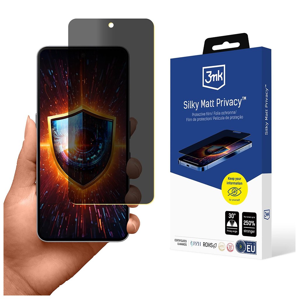Hlavnou prednosťou je funkcia Privacy, ktorá obmedzuje pozorovací uhol displeja na pouhých 30 stupňov. To znamená, že obsah vášho telefónu je viditeľný iba pre vás, zatiaľ čo pre osoby stojace vedľa sa displej javí ako tmavý. Okrem ochrany súkromia fólia tiež zvyšuje odolnosť displeja až o 250 % proti poškriabaniu a nárazom. Vďaka technológii Silky Matt je dotyk s displejom mimoriadne hladký a príjemný.