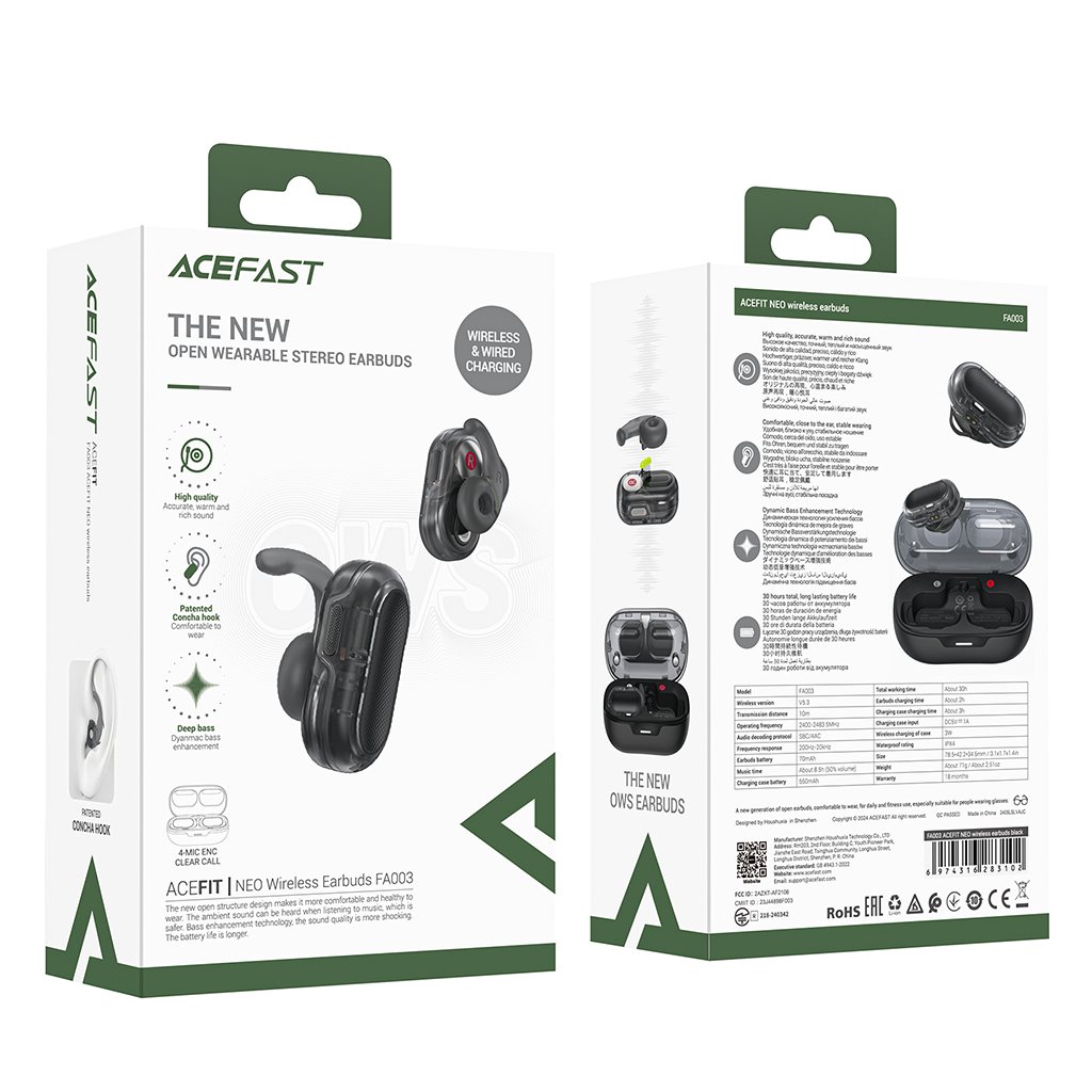 Ponorte sa do sveta krištáľovo čistého zvuku s bezdrôtovými slúchadlami Acefast Wireless Earbuds Acefit Neo v elegantnej čiernej farbe. Tieto slúchadlá sú navrhnuté pre maximálne pohodlie a špičkový zvukový zážitok, nech už ste kdekoľvek. Dizajn a pohodlie Slúchadlá Acefit Neo sa pýšia moderným a ergonomickým dizajnom, ktorý dokonale padne do ucha. Ich otvorená konštrukcia zaisťuje pohodlné nosenie po celý deň a zároveň chráni váš sluch, pretože nesedia priamo v ušnom kanáliku. Vďaka inovatívnemu háčiku Concha (ušnému háčiku) držia slúchadlá pevne a stabilne, čo je ideálne pre športové aktivity alebo každodenný pohyb. Matne čierna povrchová úprava s jemnou textúrou dodáva slúchadlám prémiový vzhľad a pocit. Kompaktné nabíjacie puzdro s priehľadným vekom je nielen praktické na prenášanie, ale aj štýlovo dopĺňa celkový dizajn. Značka Acefast Acefast je značka zameraná na inovatívne audio riešenia, ktoré spájajú moderný dizajn s pokročilými technológiami. S dôrazom na kvalitu zvuku, odolnosť a užívateľské pohodlie prináša Acefast produkty navrhnuté pre aktívny životný štýl a každodenné použitie. Kľúčové vlastnosti- Bezdrôtová technológia Bluetooth 5.3: Zaisťuje stabilné a rýchle pripojenie s nízkou latenciou.