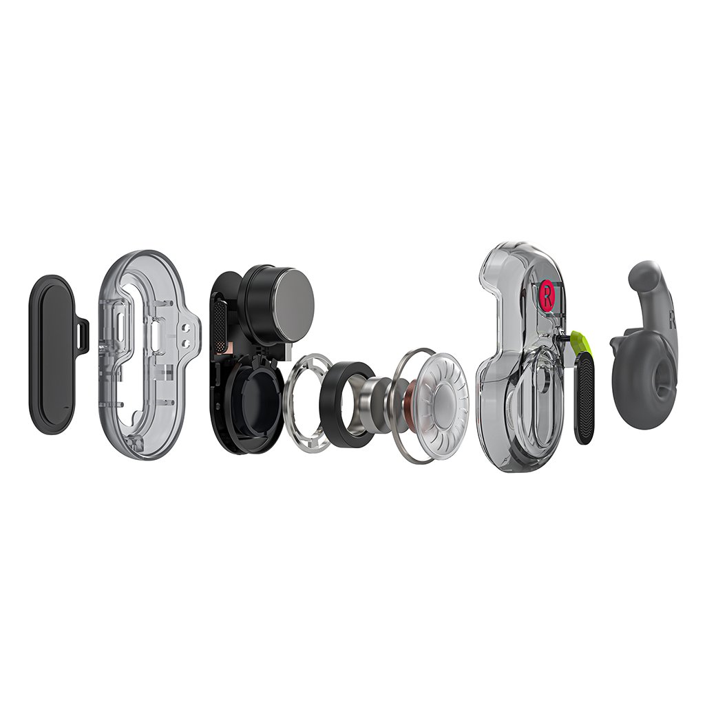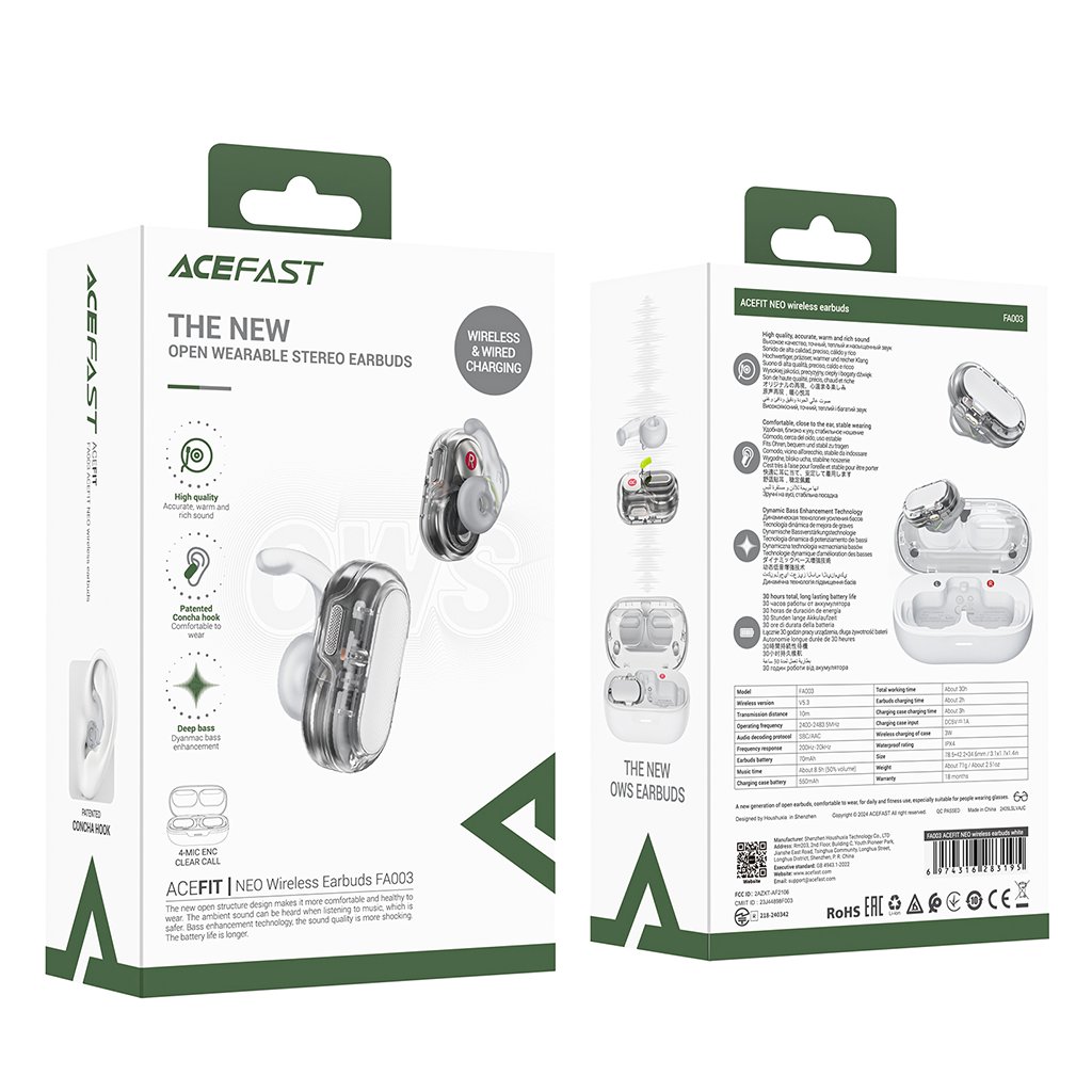 Slúchadlá Acefit Neo FA003 zaujmú svojim moderným a inovatívnym dizajnom. Samotné slúchadlá sa pýšia priehľadným telom, ktoré odhaľuje fascinujúce vnútorné komponenty a dodáva im futuristický vzhľad. Sú vybavené ergonomickými háčikmi/krídlami z priesvitného materiálu, ktoré zaisťujú stabilné a pohodlné usadenie v uchu aj počas aktívneho pohybu. Nabíjacie puzdro v elegantnej bielej farbe dopĺňa celkový dojem a je vybavené priehľadným viečkom, ktoré umožňuje jednoduchú kontrolu stavu slúchadiel. Kompaktné rozmery puzdra zaručujú ľahkú prenosnosť vo vrecku či taške.