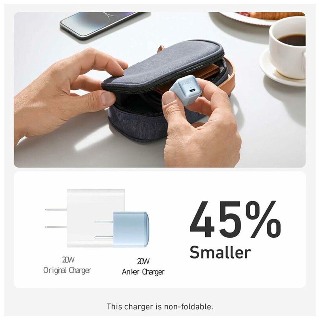 Anker Nano 3 sa pýši minimalistickým a elegantným dizajnom v čisto bielej farbe, ktorý dokonale zapadne do každého interiéru. Vďaka svojim miniatúrnym rozmerom je táto nabíjačka až o 50 % menšia ako štandardné 20W nabíjačky, čo z nej robí ideálnu voľbu pre cestovanie. Napriek svojej veľkosti poskytuje maximálny výkon 20W, ktorý zaistí rýchle a bezpečné nabitie vášho zariadenia. Technológia PowerIQ 3.0 inteligentne detekuje pripojené zariadenie a dodáva mu optimálny prúd pre najrýchlejšie možné nabíjanie.