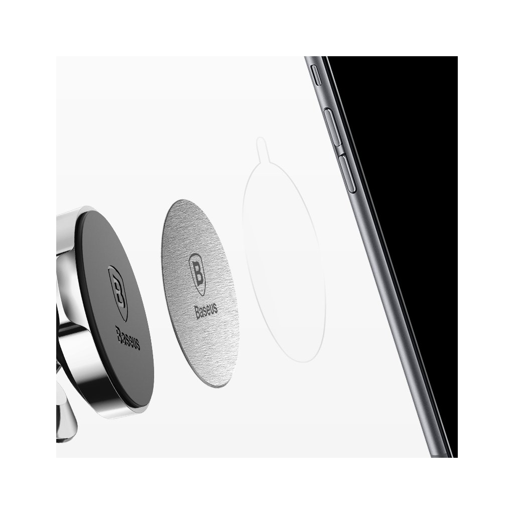 Balenie obsahuje dve unikátne doštičky, ktoré sa dokonale prispôsobia vášmu štýlu. Prvá doštička je vyrobená z kvalitnej PU kože v elegantnej čiernej farbe, ktorá dodáva luxusný vzhľad a príjemný dotyk. Druhá doštička sa pýši povrchom z brúseného kovu v striebornom odtieni, čo jej prepožičiava moderný a minimalistický vzhľad. Obe doštičky sú okrúhleho tvaru a sú diskrétne označené logom Baseus, ktoré symbolizuje kvalitu a inováciu. Vďaka svojmu tenkému profilu a precíznemu spracovaniu sa ľahko pripevnia na zadnú stranu telefónu alebo pod kryt, bez toho, aby narušili jeho dizajn alebo pridali zbytočný objem.