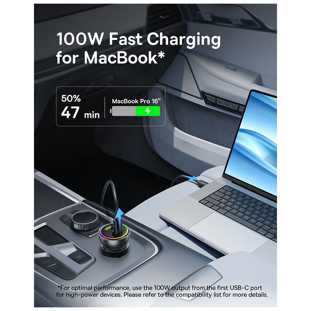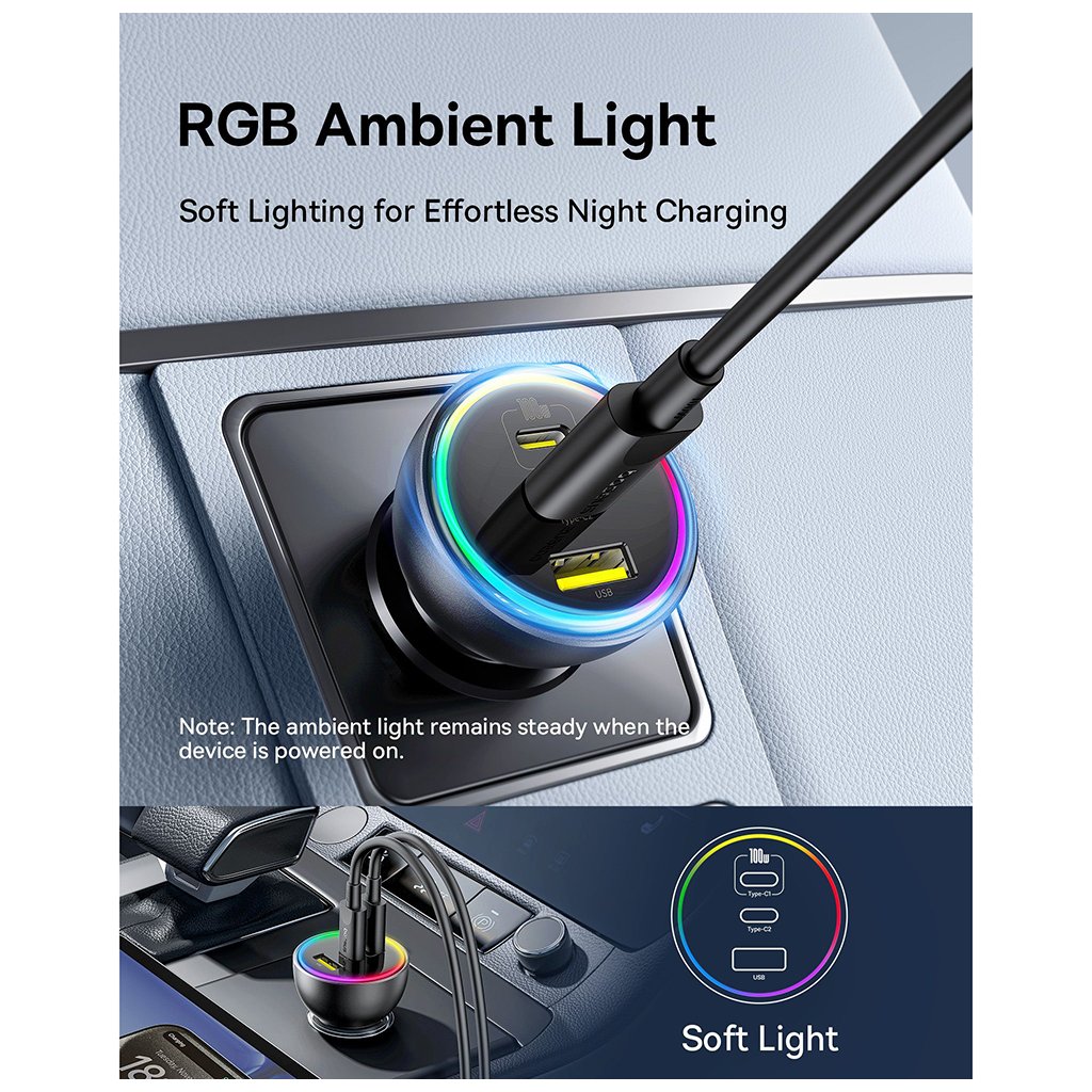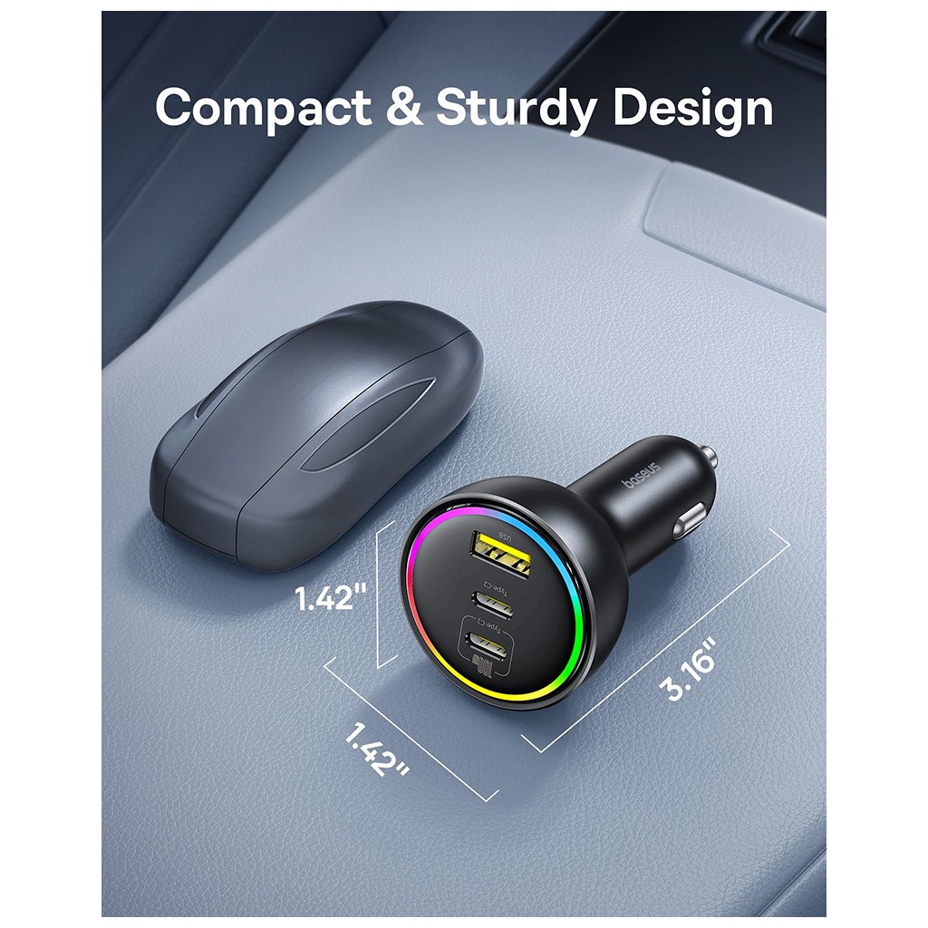 Autonabíjačka Baseus sa pýši elegantným čiernym prevedením, ktoré dokonale zapadne do interiéru každého moderného vozidla. Jej kompaktná a robustná konštrukcia zaručuje dlhú životnosť a spoľahlivosť. Jedným z najvýraznejších prvkov je integrované RGB osvetlenie, ktoré dodáva nabíjačke futuristický vzhľad a zároveň uľahčuje jej nájdenie v tme.