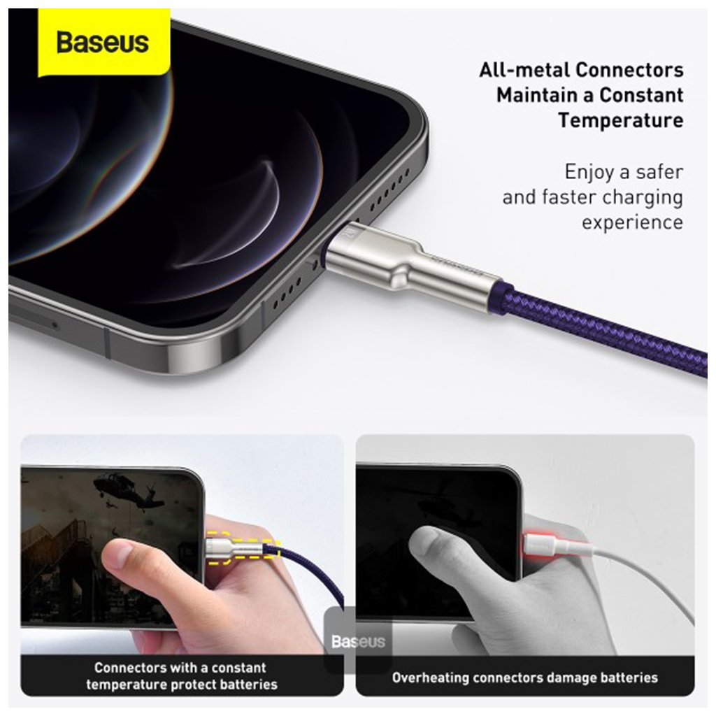Predstavujeme vám Baseus Cafule Metal CALJK-B05, vysokokvalitný USB Lightning kábel, ktorý kombinuje výnimočnú odolnosť, rýchle nabíjanie a elegantný dizajn. Tento kábel je ideálnou voľbou pre každého, kto hľadá spoľahlivé a dlhotrvajúce riešenie pre nabíjanie a synchronizáciu svojich Apple zariadení. Dizajn a konštrukcia Kábel Baseus Cafule Metal CALJK-B05 sa pýši prémiovým spracovaním. Jeho fialové opletenie z odolného materiálu nielenže dodáva káblu moderný a štýlový vzhľad, ale zároveň zaisťuje vysokú odolnosť proti zamotaniu a mechanickému poškodeniu. Kovové konektory, vyrobené z kvalitnej zliatiny, sú navrhnuté tak, aby vydržali každodenné používanie a poskytovali stabilné a bezpečné pripojenie. Vďaka ich celokovovej konštrukcii udržujú konštantnú teplotu, čo prispieva k bezpečnejšiemu a rýchlejšiemu nabíjaniu. Vnútorná štruktúra kábla obsahuje štyri pramene zosilnených jadier, ktoré zvyšujú vodivú plochu a znižujú rušenie pre ešte stabilnejší prenos dát a nabíjanie. Parametre a výkon- Typ konektora: USB-A na Lightning