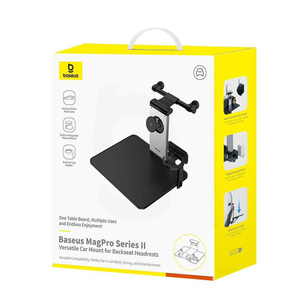 Predstavujeme Baseus Car Holder MagPro II, inovatívne a multifunkčné riešenie pre maximálne pohodlie a zábavu na zadných sedadlách vášho vozidla. Tento držiak, navrhnutý s dôrazom na praktickosť a elegantný dizajn, premení cestovanie na príjemný zážitok pre všetkých pasažierov. Držiak Baseus MagPro II sa pýši moderným a minimalistickým dizajnom v elegantnej kozmickej čiernej farbe, doplnený o strieborné metalické prvky, ktoré dokonale zapadnú do interiéru každého automobilu. Jeho hlavnou prednosťou je sklápacia konštrukcia, ktorá umožňuje jednoduché zloženie, keď nie je používaný, a zabezpečuje tichý chod bez rušivých zvukov počas jazdy. Súčasťou držiaka je integrovaný magnetický držiak telefónu s možnosťou otáčania o 360°, čo zaručuje optimálny pozorovací uhol pre sledovanie filmov, hranie hier alebo videohovory. Vďaka silným magnetom je váš telefón pevne a bezpečne uchytený. Ďalšou praktickou súčasťou je výklopný stolík, ktorý poskytuje stabilnú plochu pre prácu, jedlo alebo zábavu. Stolík je navrhnutý tak, aby uniesol záťaž až 20 kg, čo svedčí o jeho robustnosti a odolnosti. Nechýba ani integrovaný držiak na nápoje, ktorý sa dá jednoducho vyklopiť a zase skryť, keď nie je potrebný, a zabezpečí tak bezpečné uloženie vášho pitia.- Typ produktu: Multifunkčný držiak do auta na opierku hlavy