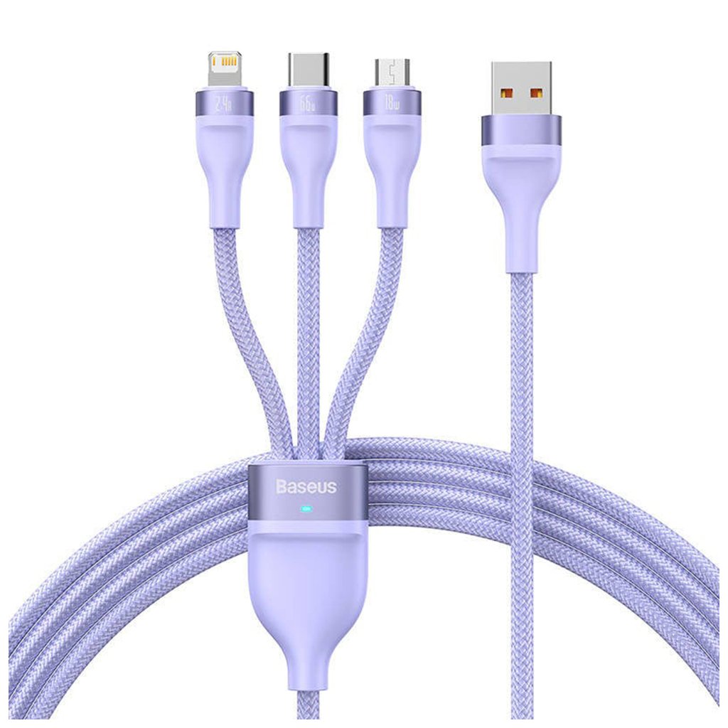 Predstavujeme vám dátový kábel Baseus Flash Series 2 – elegantné a vysoko funkčné riešenie pre nabíjanie a synchronizáciu vašich zariadení. Tento inovatívny kábel 3v1 v nádhernej fialovej farbe je navrhnutý tak, aby splnil všetky vaše potreby s maximálnou efektivitou a štýlom. Dizajn a spracovanie Kábel Baseus Flash Series 2 zaujme na prvý pohľad svojim moderným a minimalistickým dizajnom. Je vyhotovený v jemnej fialovej farbe, ktorá dodá vášmu technickému vybaveniu šmrnc. Opletený povrch kábla zaisťuje výnimočnú odolnosť proti zamotaniu a mechanickému poškodeniu, čo predlžuje jeho životnosť a udržuje ho v perfektnom stave aj pri každodennom používaní. Konektory sú vyrobené z kvalitných materiálov s ergonomickým tvarom pre jednoduché a bezpečné pripojenie. Centrálny rozbočovač s decentným logom Baseus a integrovanou LED diódou elegantne spája tri nabíjacie vetvy a signalizuje stav nabíjania. Kľúčové vlastnosti a parametre