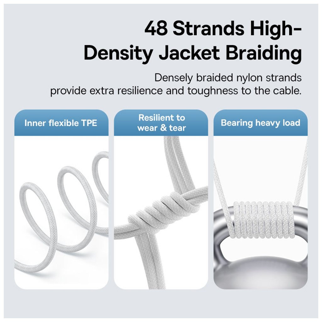 Kábel Baseus Gem sa vyznačuje nielen svojimi technickými parametrami, ale aj premysleným dizajnom. Jeho povrchová úprava vo farbe MoonWhite dodáva káblu luxusný a minimalistický vzhľad, ktorý skvele doplní vaše zariadenie. Konštrukcia kábla je navrhnutá s dôrazom na maximálnu odolnosť a dlhú životnosť. Zosilnené konektory a kvalitné materiály efektívne predchádzajú lámaniu a opotrebovaniu, čo zaisťuje spoľahlivosť aj pri každodennom intenzívnom používaní. Vďaka tomu je kábel flexibilný a zároveň robustný.