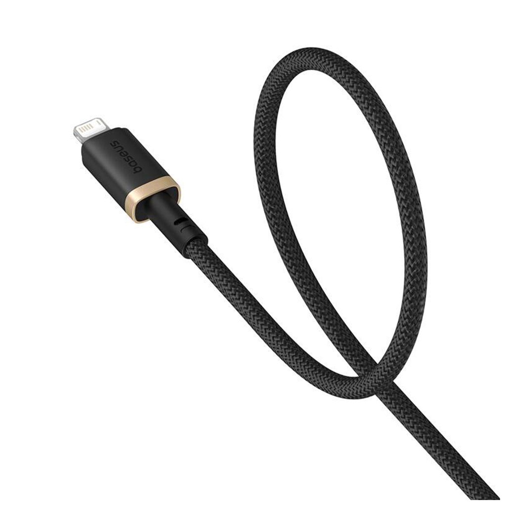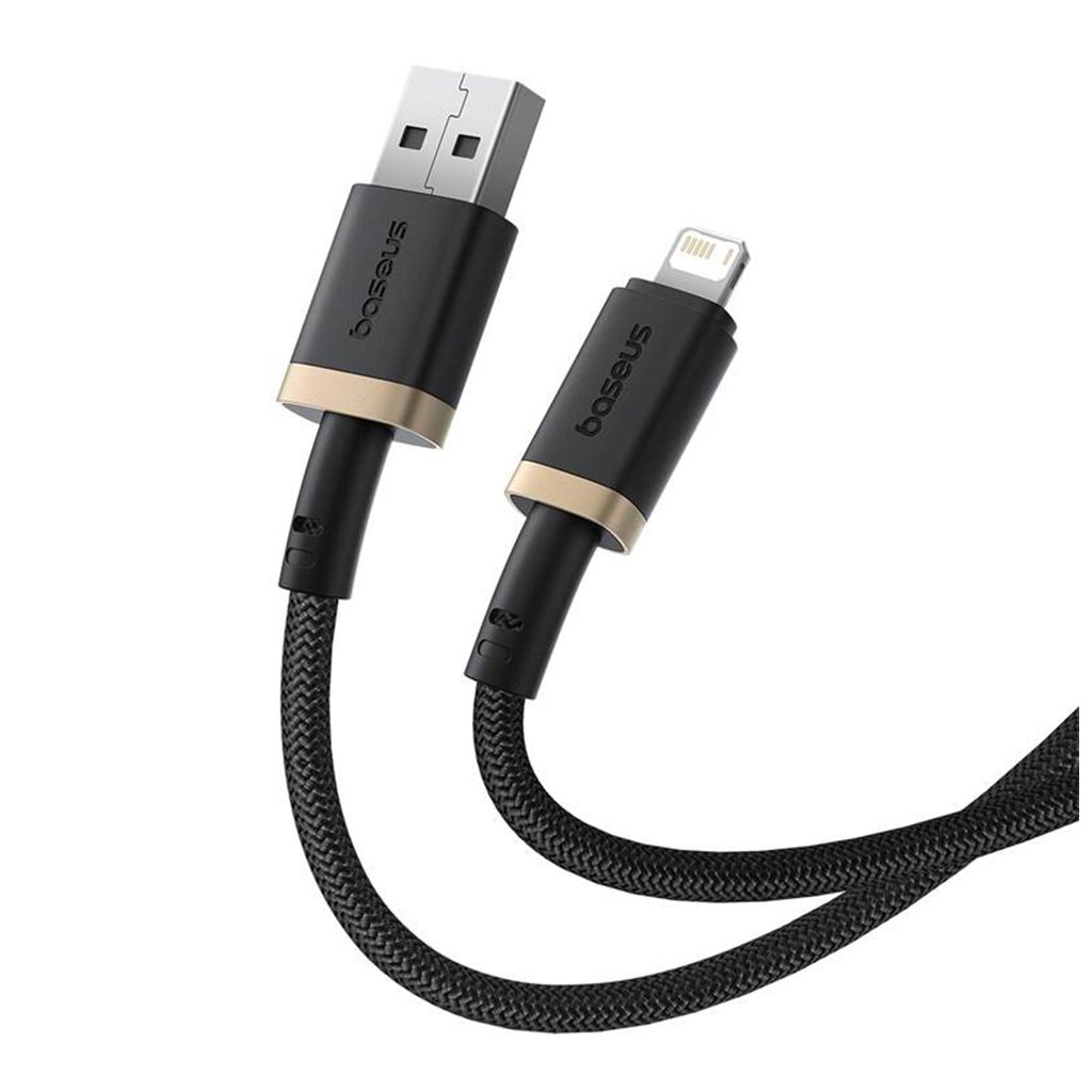 Kábel Baseus Dura Series zaujme na prvý pohľad svojím sofistikovaným dizajnom. Je vyvedený v čiernej farbe s vysoko hustým nylonovým opletením, ktoré mu propůjčuje nielen luxusný vzhľad, ale predovšetkým výnimočnú odolnosť proti zamotaniu a mechanickému poškodeniu. Konektory USB-A a Lightning sú vyrobené z nerozbitej hliníkovej zliatiny a zdobí ich elegantný zlatý prstenec, ktorý podčiarkuje prémiový charakter produktu.