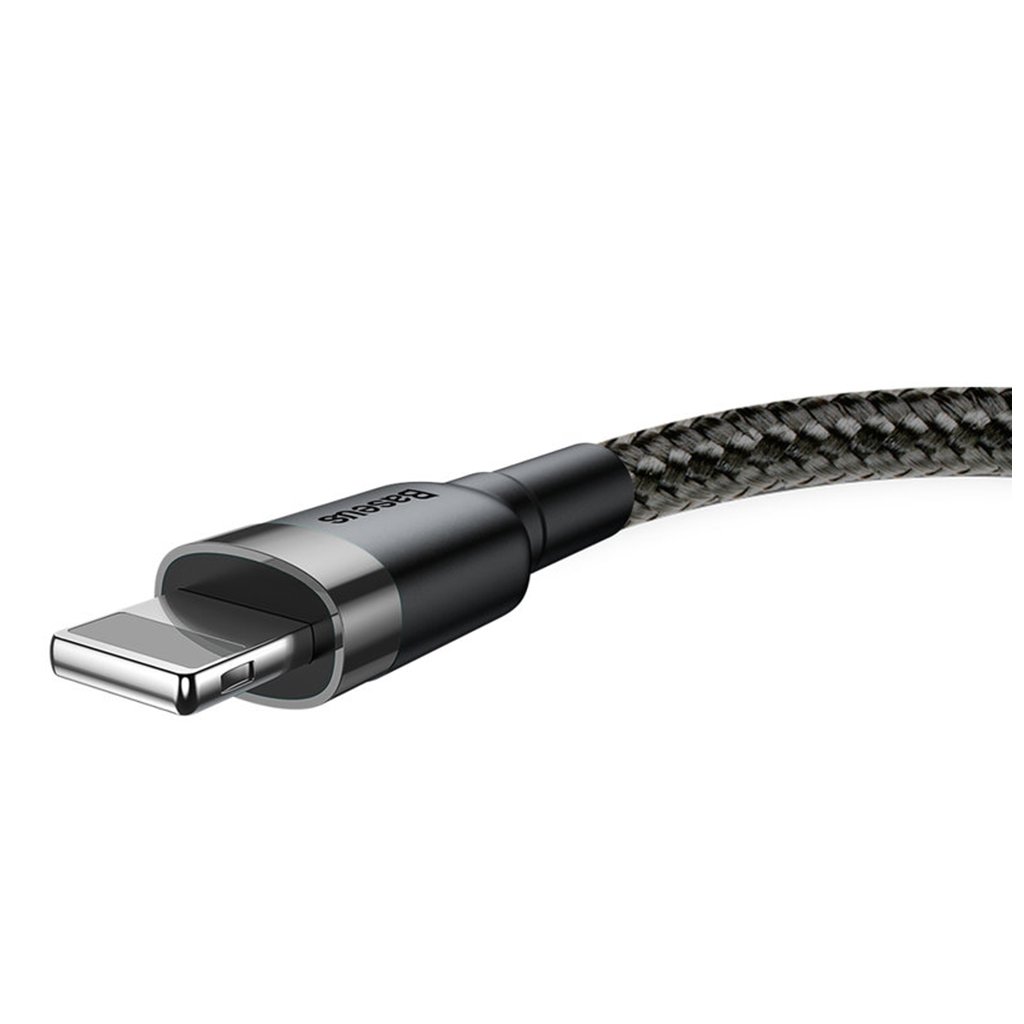 Kábel Baseus Cafule sa pýši elegantným a funkčným dizajnom v kombinácii čiernej a sivej farby. Jeho povrch je tvorený odolným opletením, ktoré výrazne zvyšuje životnosť kábla a chráni ho pred zamotaním, ohýbaním a každodenným opotrebovaním. Konektory sú vyrobené z robustných materiálov v tmavosivej farbe s elegantnými striebornými akcentmi, čo dodáva káblu prémiový vzhľad a zaisťuje pevné a stabilné pripojenie. Logo Baseus je decentne umiestnené na Lightning konektore, čo podčiarkuje kvalitu značky.