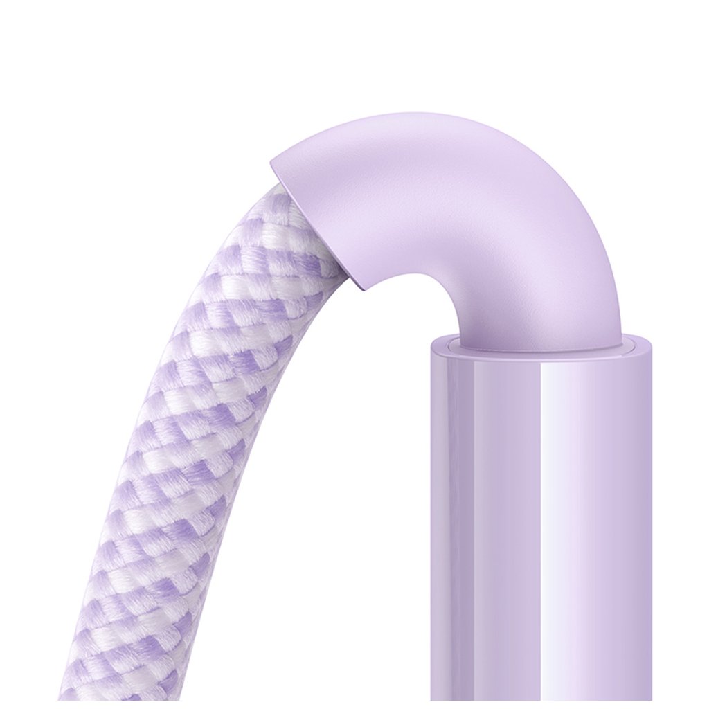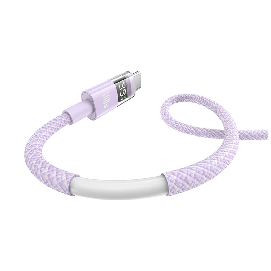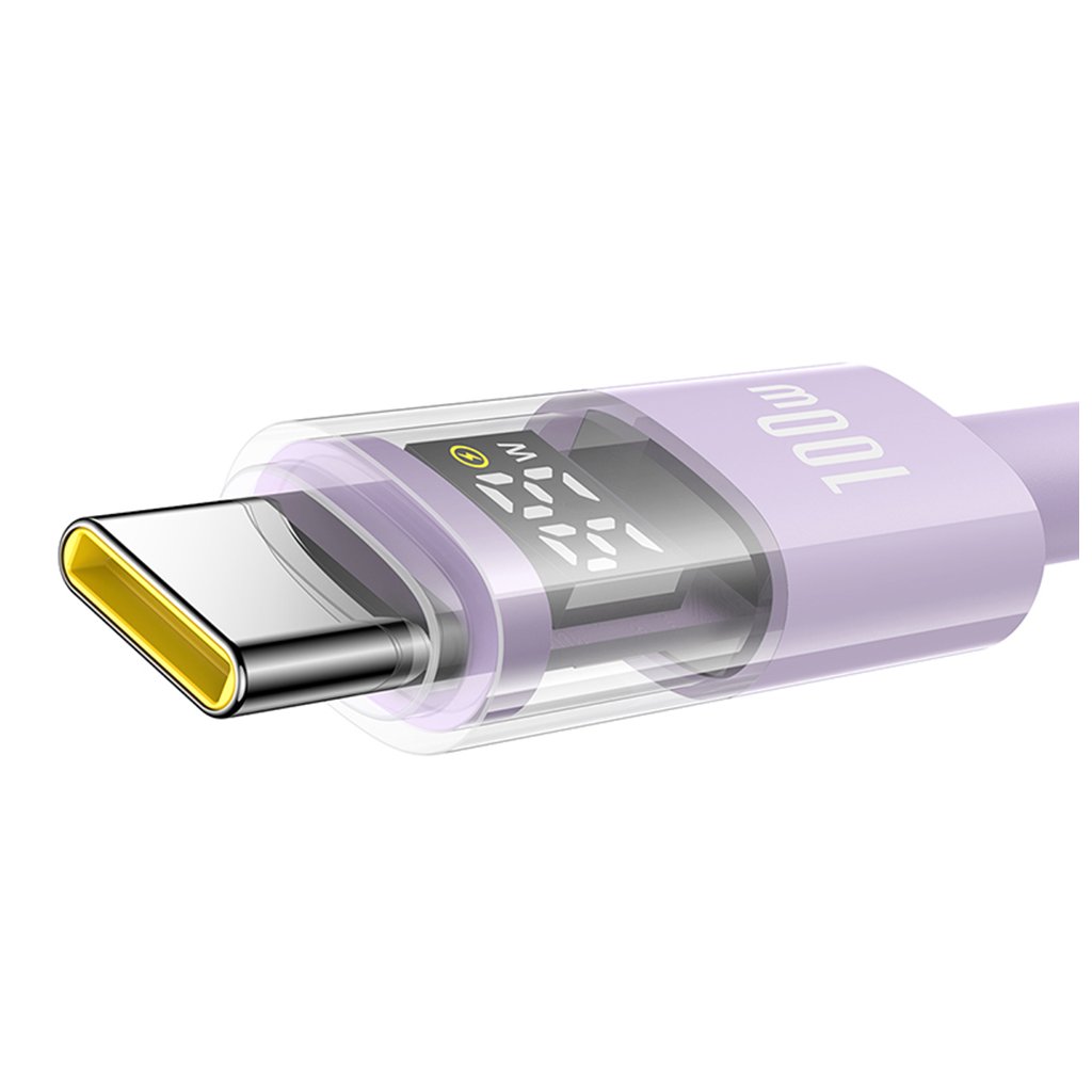 Design kábla Baseus Data Cable Display 2 je rovnako pôsobivý ako jeho výkon. Kábel sa pýši elegantnou fialovou farbou a je potiahnutý odolným pleteným materiálom, ktorý zaručuje dlhú životnosť a odolnosť proti zamotaniu a opotrebovaniu. Jedinečným prvkom je integrovaný digitálny displej na jednom z konektorov, ktorý v reálnom čase zobrazuje aktuálny nabíjací výkon vo wattoch. Tento transparentný dizajn konektora nielen skvele vyzerá, ale tiež poskytuje užitočnú spätnú väzbu o procese nabíjania.