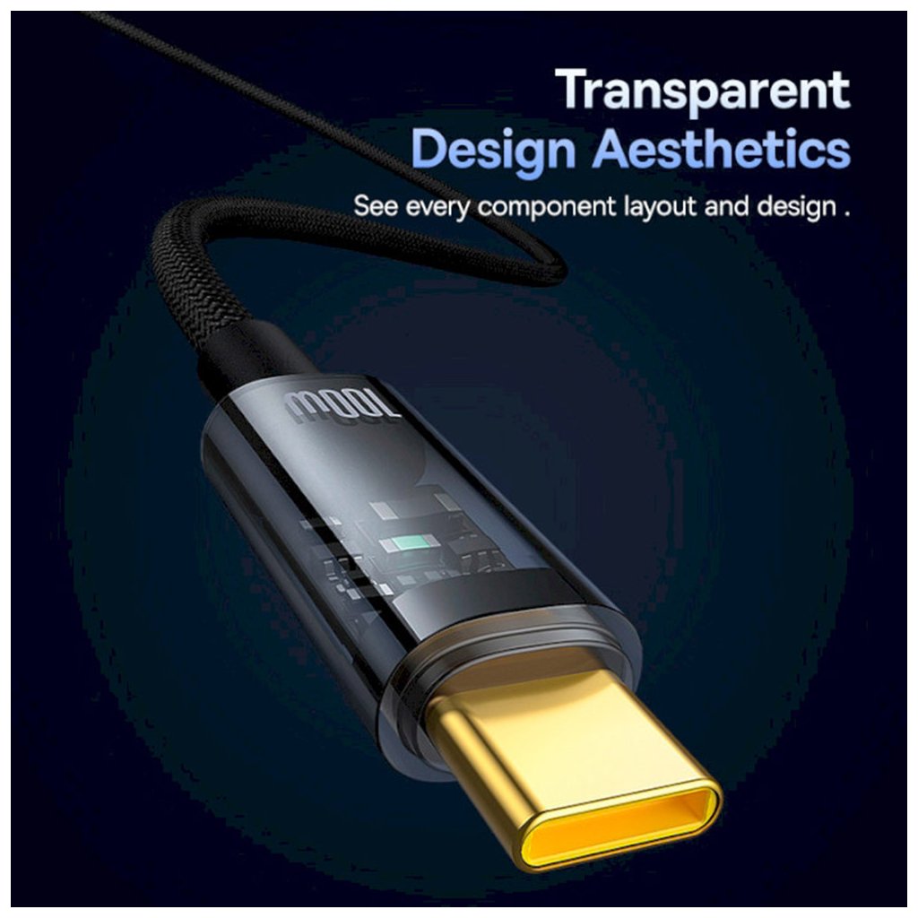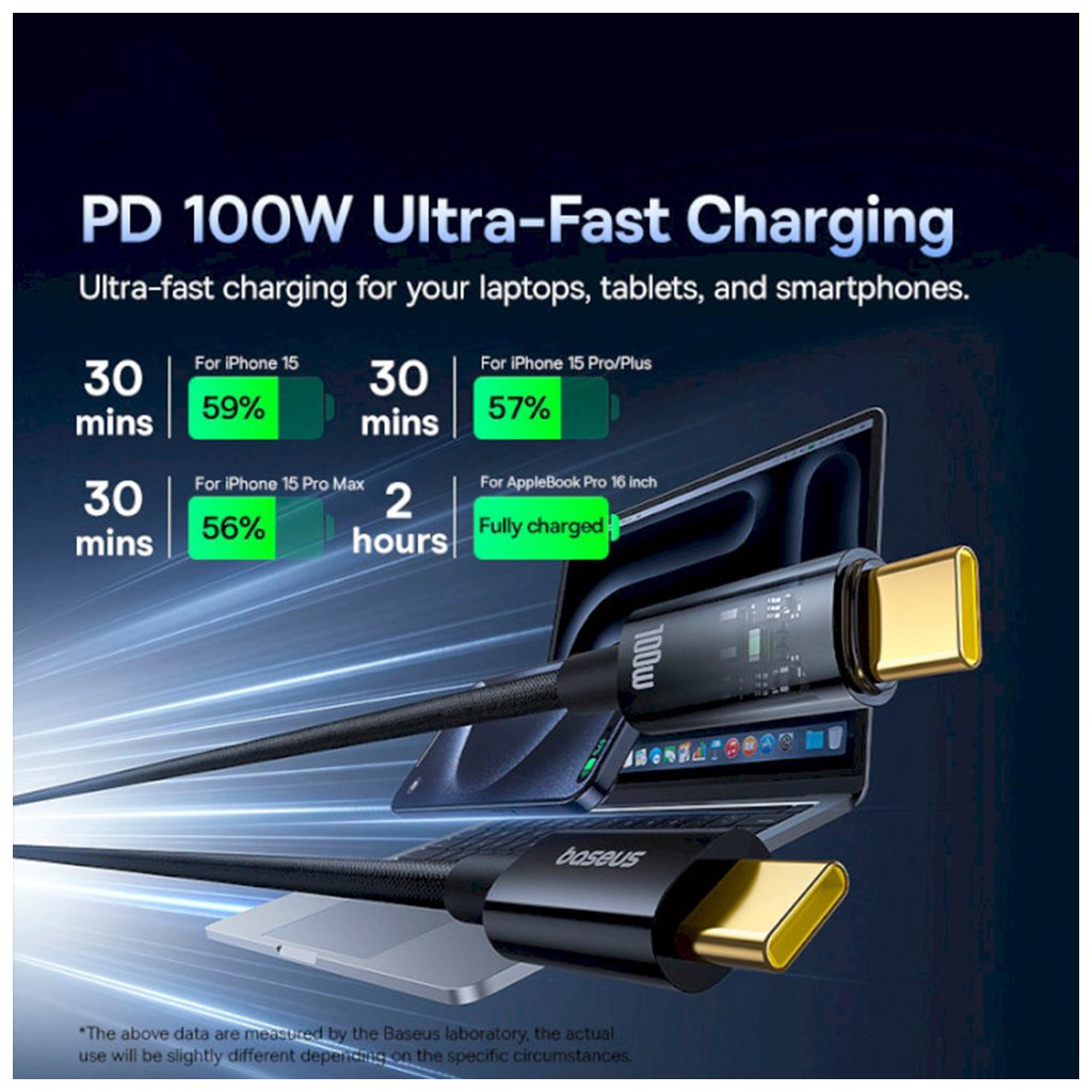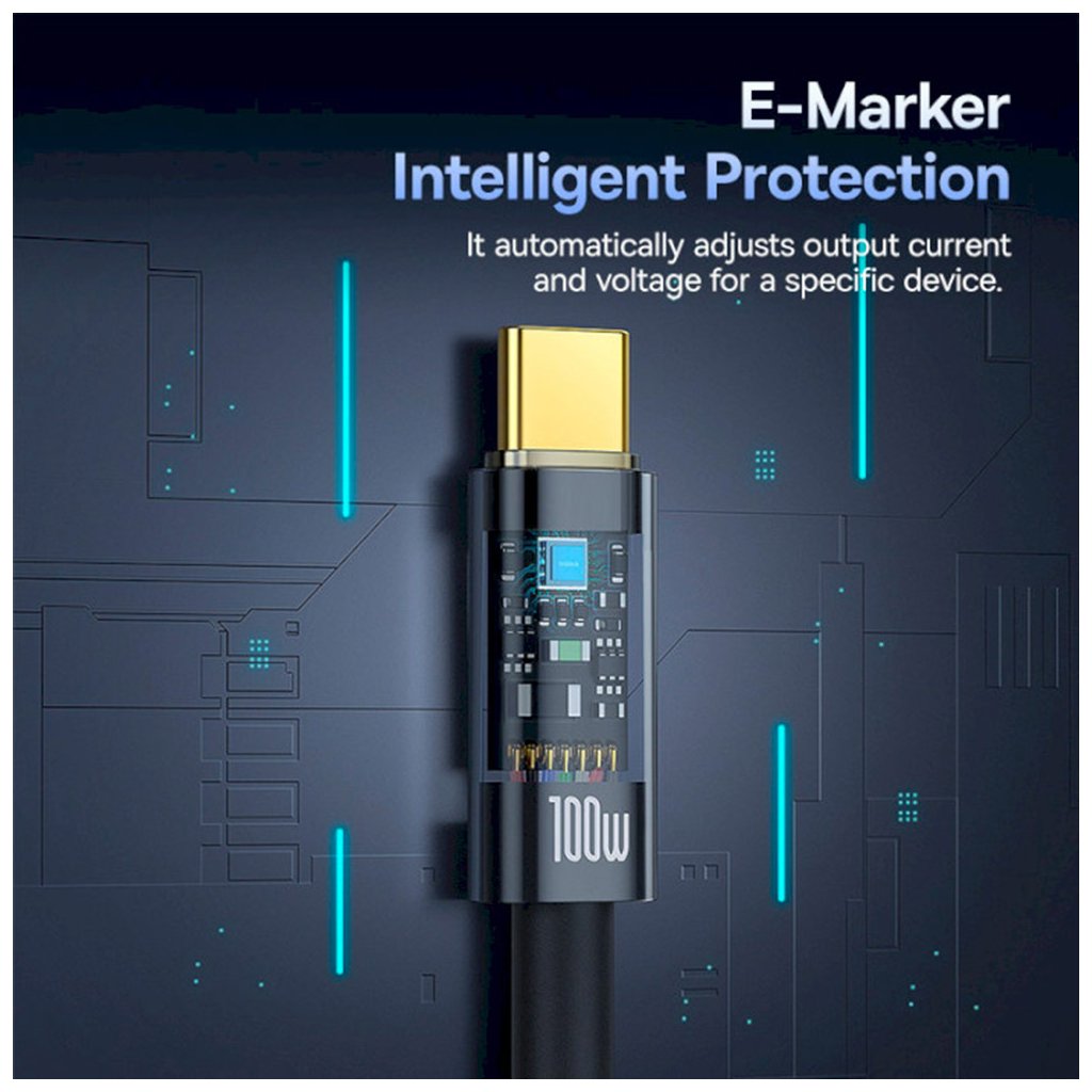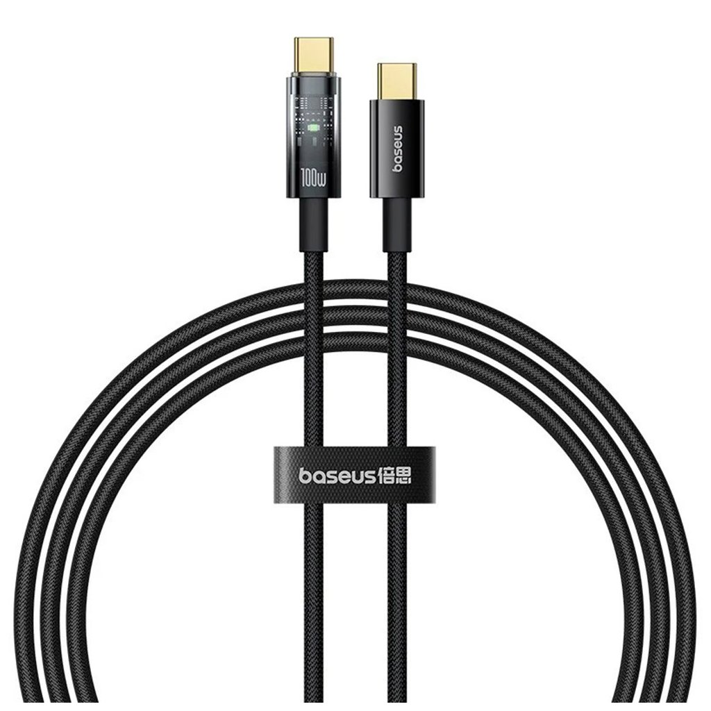 Dizajn kábla Baseus Explorer je nielen funkčný, ale aj esteticky príťažlivý. Kabel je vyvedený v elegantnej čiernej farbe a je opletený odolným nylonom, ktorý zaisťuje vysokú odolnosť proti zamotaniu a mechanickému poškodeniu. Koncovky Type-C sú opatrené pozlátenými konektormi pre maximálnu vodivosť a odolnosť proti korózii. Jedna z koncoviek sa pýši transparentným dizajnom, ktorý odhaľuje vnútorné obvody a indikátor výkonu 100W, čo podčiarkuje futuristický vzhľad a technologickú vyspelosť produktu.