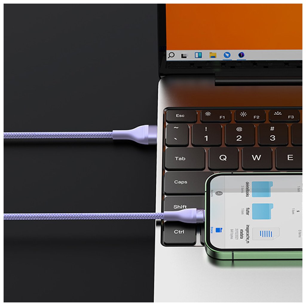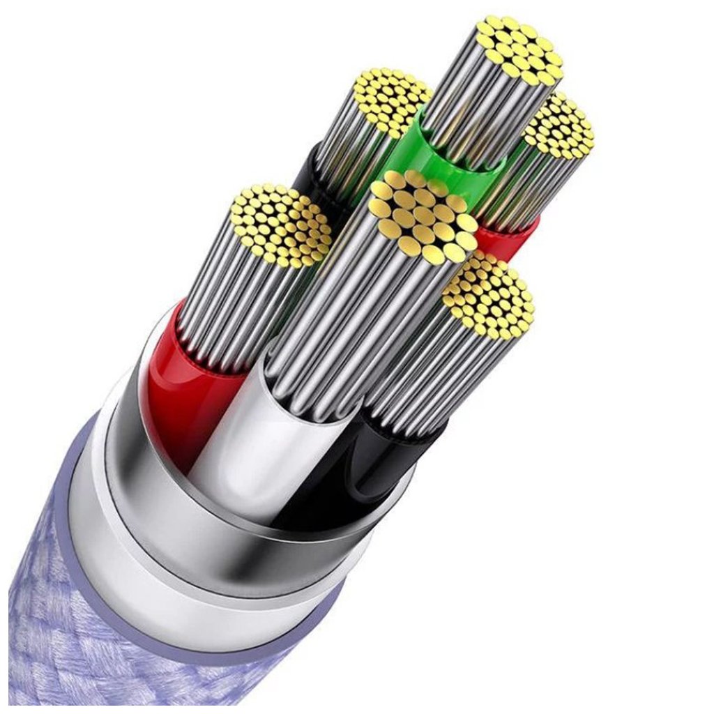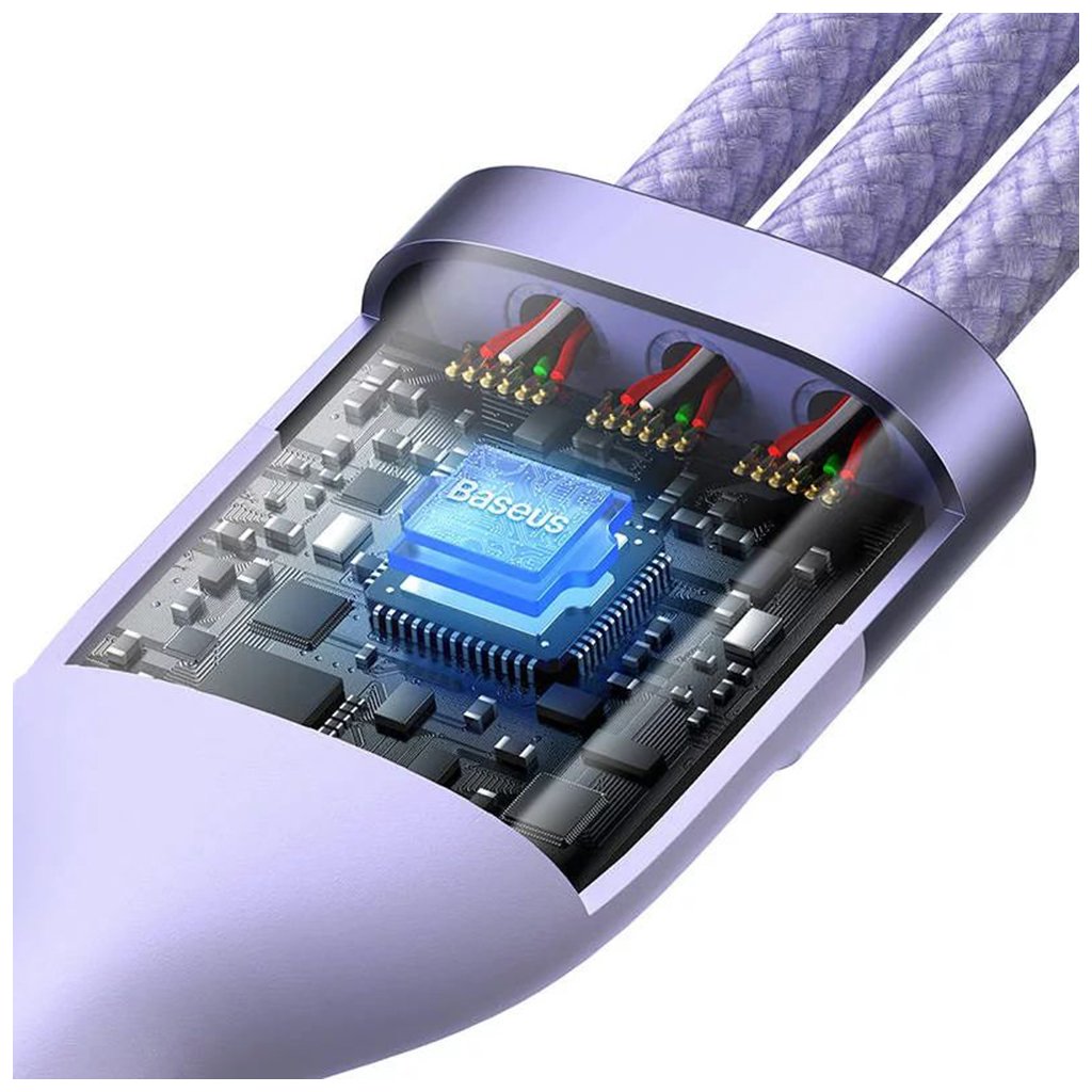 Kábel Baseus Flash Series 2 zaujme na prvý pohľad svojim moderným a praktickým dizajnom. Je vyhotovený v príjemnej svetlofialovej farbe a disponuje odolným opletením, ktoré zaisťuje dlhú životnosť a zabraňuje zamotávaniu. Robustné konektory s kovovými akcentmi sú navrhnuté pre časté používanie a spoľahlivé pripojenie. Centrálny rozbočovač, z ktorého sa kábel delí na tri rôzne koncovky, je vybavený diskrétnou LED diódou, ktorá indikuje stav nabíjania. Vnútorná konštrukcia kábla odhaľuje starostlivo tienené vodiče, čo podčiarkuje vysokú kvalitu a bezpečnosť prenosu energie aj dát.