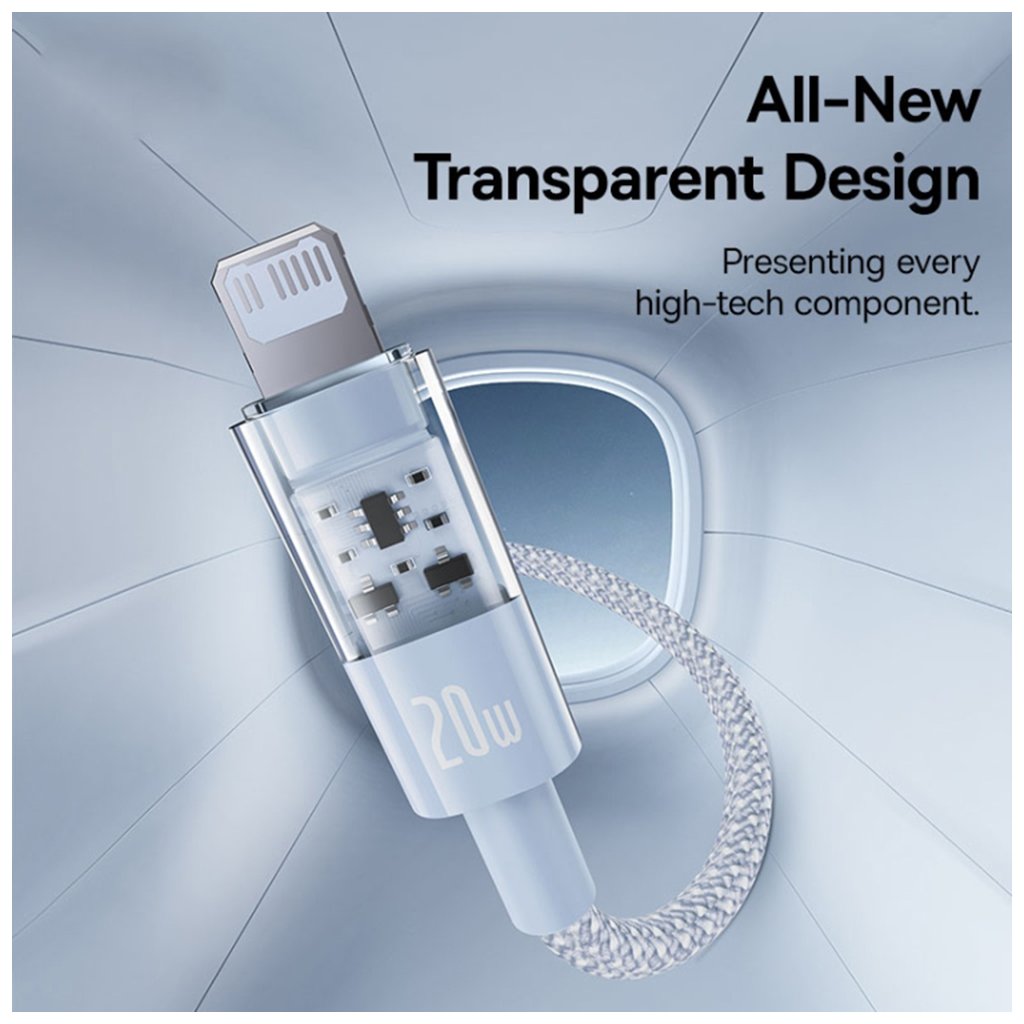 Dizajn kábla Baseus Gem je skutočne výnimočný. Vyznačuje sa transparentnou estetikou, ktorá odhaľuje vnútorné high-tech komponenty Lightning konektora, čo dodáva produktu futuristický vzhľad. Kábel je v nádhernej farbe Galaxy Blue a jeho povrch tvorí husto pletené nylonové vlákno so 48 prameňmi. Táto konštrukcia zaisťuje extrémnu odolnosť proti opotrebovaniu a roztrhnutiu a schopnosť znášať vysoké zaťaženie, zatiaľ čo vnútorný flexibilný TPE materiál zaručuje dlhú životnosť.