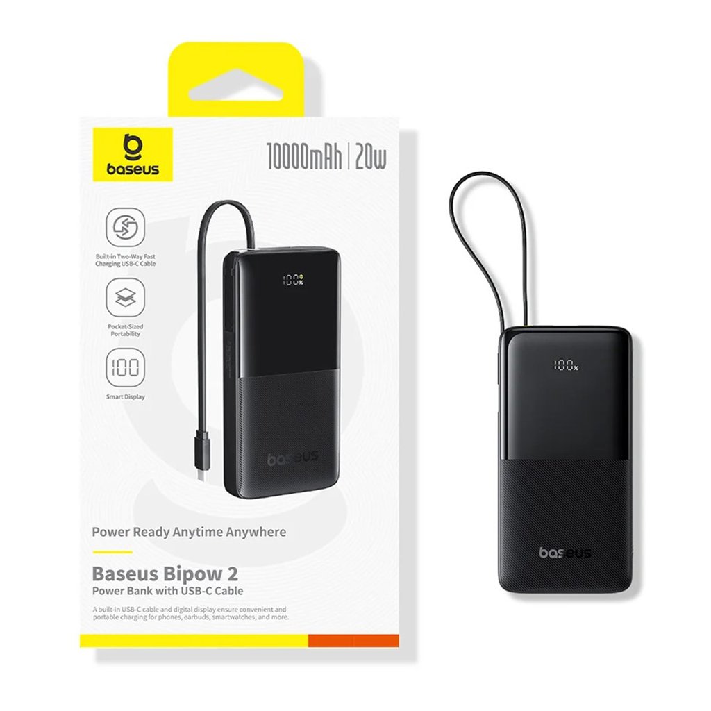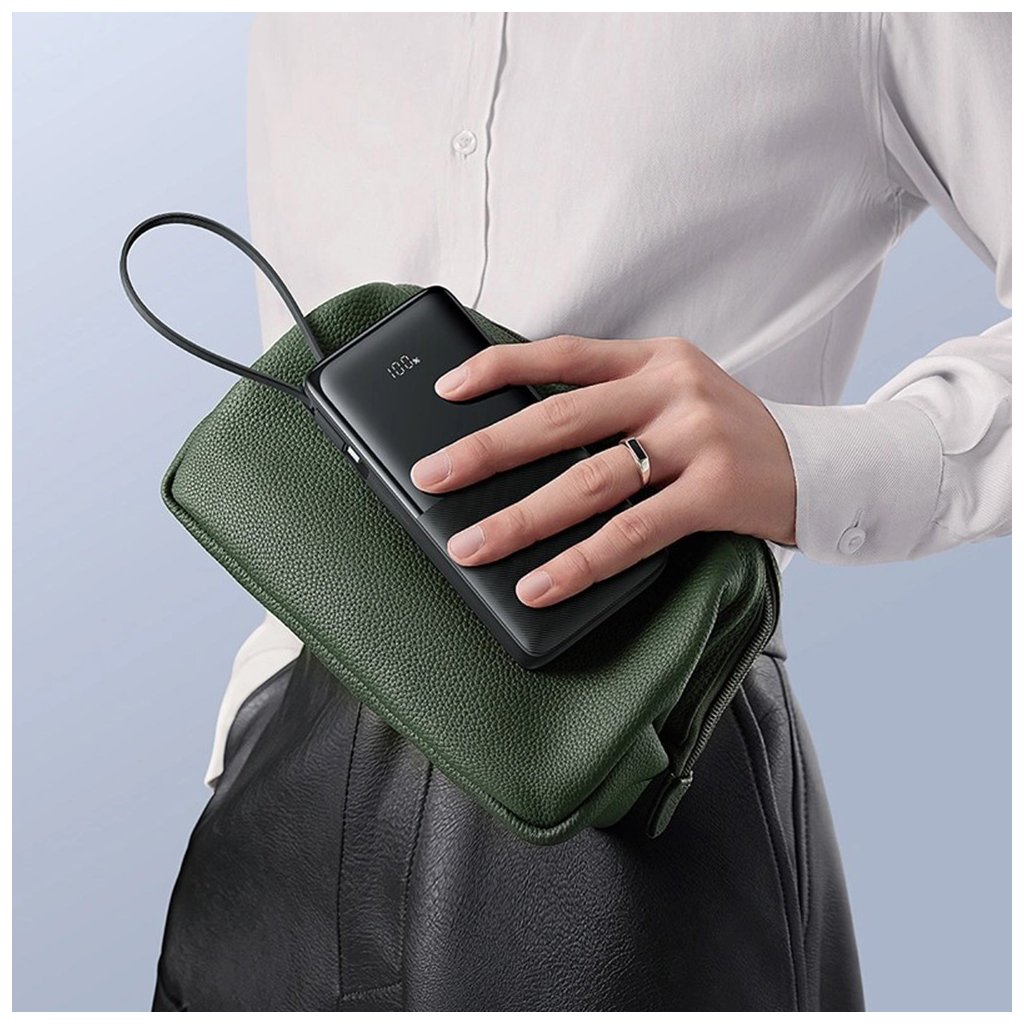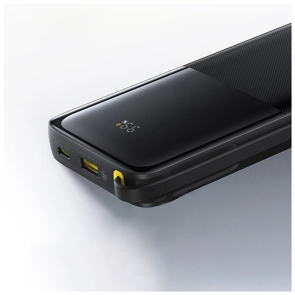 Dizajn power banky Baseus Bipow 2 je ztelesnením minimalizmu a elegancie. Jej kompaktné rozmery a čisté línie z nej robia štýlový doplnok. Spodná časť power banky je opatrená jemnou textúrou, ktorá zaisťuje pevný a príjemný úchop, zatiaľ čo horná časť je hladká a dominuje jej integrovaný digitálny displej. Ten prehľadne zobrazuje aktuálny stav nabitia batérie v percentách, takže vždy viete, koľko energie vám zostáva. Klíčovým prvkom je vestavěný USB-C kábel, ktorý nielenže slúži na nabíjanie vašich zariadení, ale zároveň funguje ako praktické pútko pre jednoduché prenášanie.