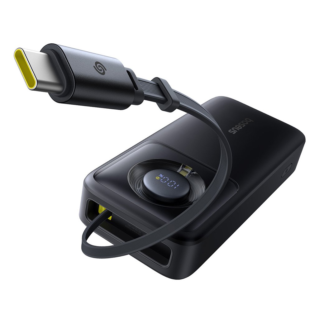 Dizajn power banky Baseus Free2Pull je synonymom pre minimalizmus a funkčnosť. Jej elegantné čierne telo s matným povrchom pôsobí moderne a príjemne sa drží v ruke. Integrovaný USB-C kábel je plochý a diskrétne zasunutý do tela power banky, čo zaisťuje maximálnu prenosnosť a eliminuje zamotanie. Kruhový digitálny displej je vkusne zapustený do povrchu a poskytuje okamžitý prehľad o stave nabitia. Celkový vzhľad podčiarkuje prémiový charakter produktu, ktorý sa stane nielen praktickým, ale aj štýlovým doplnkom.