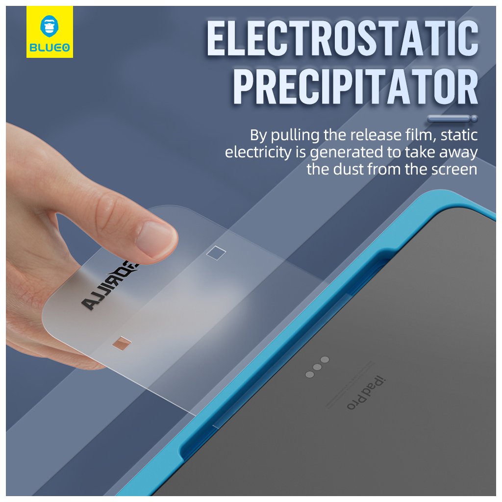 Dizajn tvrdeného skla Blueo je premyslený do posledného detailu. Jeho ultra tenký profil dokonale splynie s displejom vášho iPadu, aniž by narušil jeho elegantný vzhľad. Kľúčovou inováciou je priložený aplikátor, ktorý zaisťuje extrémne jednoduchú a presnú inštaláciu bez bublín a prachu. Vďaka funkcii elektrostatického odlučovača prachu je pri odstraňovaní ochranného filmu generovaná statická elektrina, ktorá efektívne odstráni všetok prach z povrchu displeja, čo zaručuje dokonale čistú aplikáciu. Už žiadne frustrujúce pokusy o nalepenie skla – s Blueo je inštalácia otázkou okamihu.