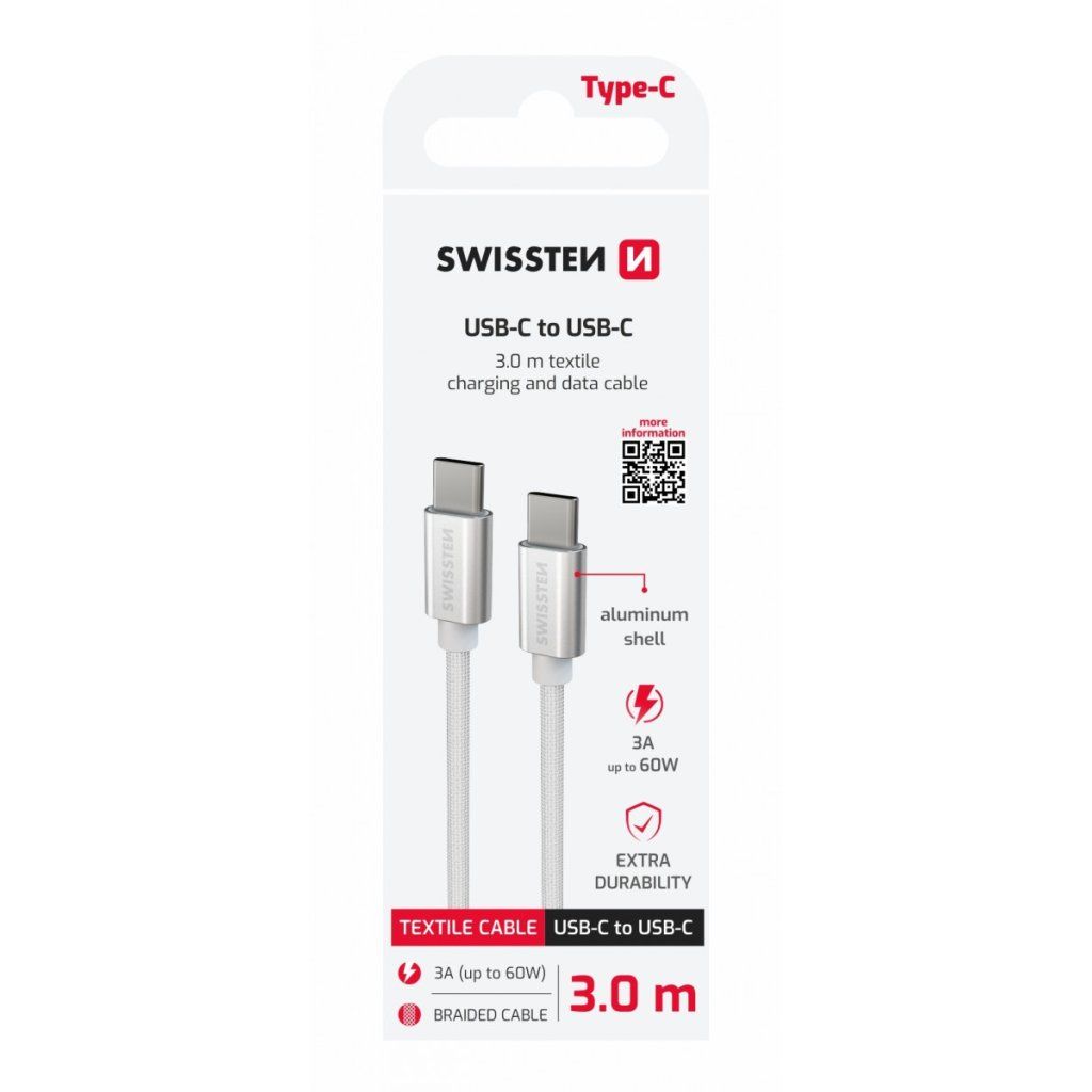 Dátový kábel Swissten Textile USB-C / USB-C 3.0 m strieborný