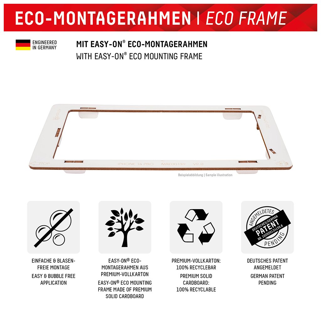 - Inštalácia je navyše jednoduchá a bez bublín vďaka priloženému montážnemu rámčeku Easy-On® Eco, ktorý je vyrobený zo 100% recyklovateľného prémiového kartónu.