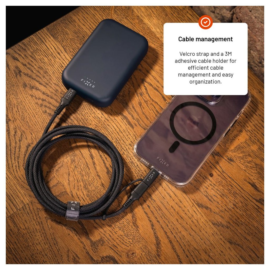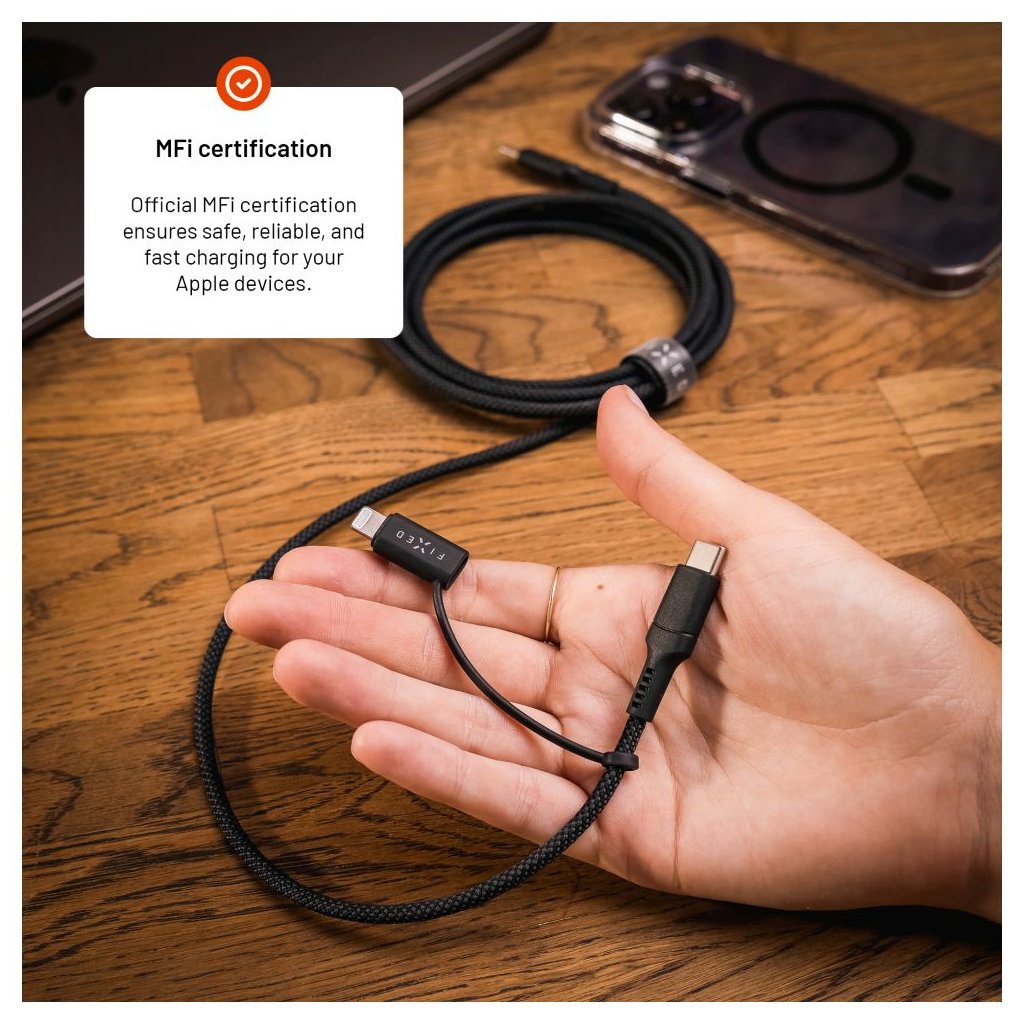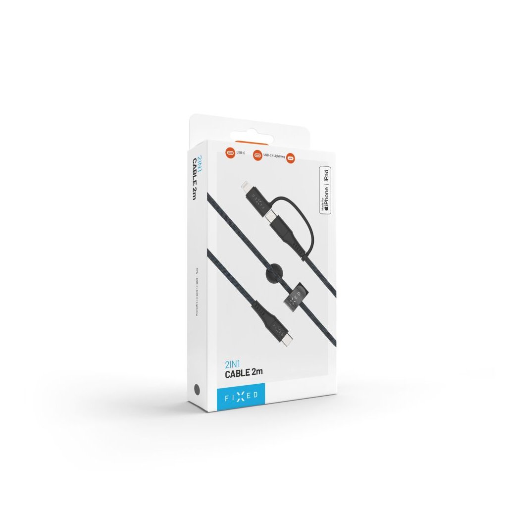 Nabíjací a dátový kábel FIXED 2 v 1 s konektormi USB‑C/USB‑C a prídavným adaptérom Lightning je navrhnutý pre všestranné použitie so širokou škálou zariadení vrátane smartfónov, tabletov, notebookov a príslušenstva Apple. Certifikácia MFi zaručuje plnú kompatibilitu so zariadeniami Apple a bezpečnú prevádzku.