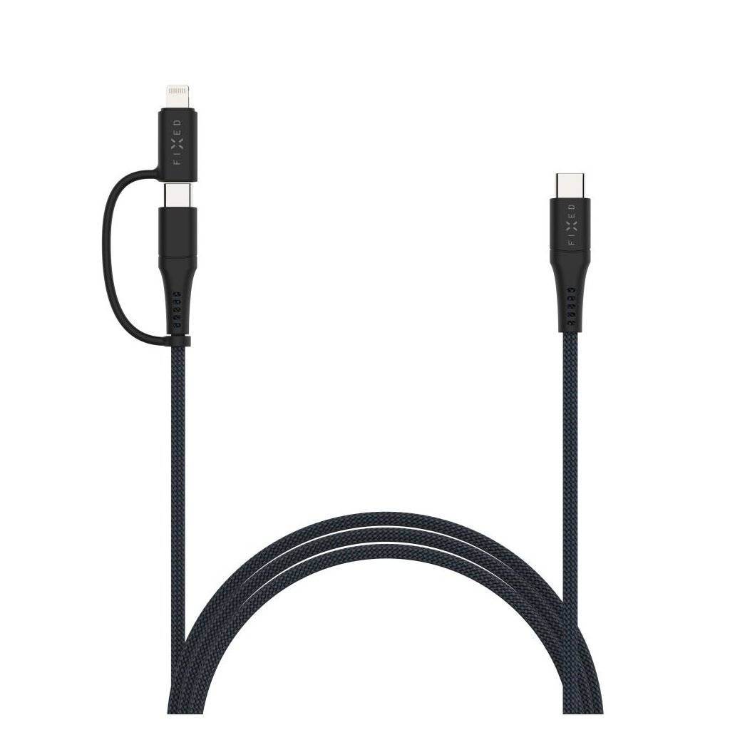 Dlhý nabíjací a dátový opletený kábel FIXED s konektormi USB-C-USB-C a adaptérom Lightning PD 3 m MFi PD 60 W sivý