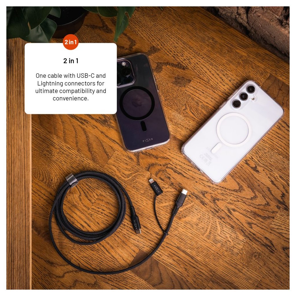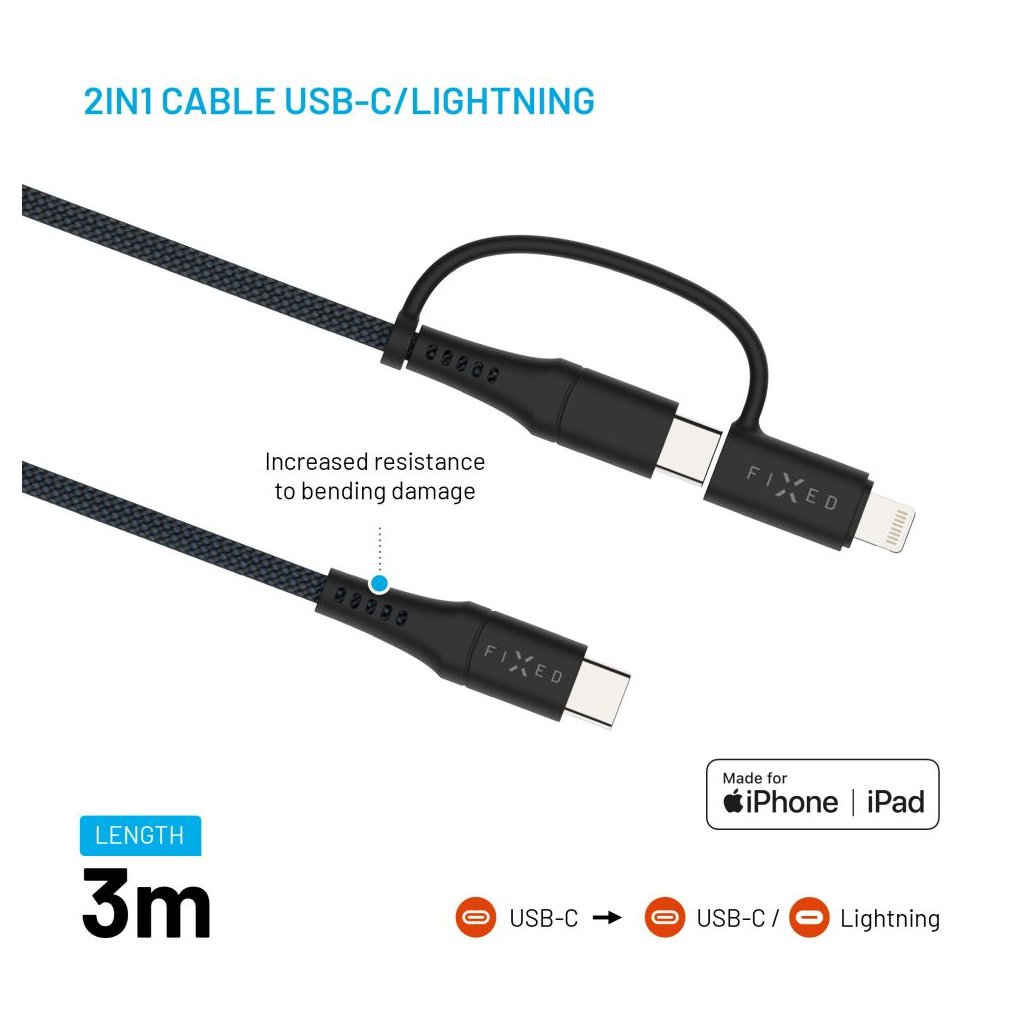 Dlhý nabíjací a dátový opletený kábel FIXED s konektormi USB-C–USB-C a adaptérom Lightning PD 3 m MFi PD 60 W sivýNabíjací a dátový kábel FIXED 2 v 1 s konektormi USB-C/USB-C a prídavným adaptérom Lightning je navrhnutý pre všestranné použitie. Je ideálny pre širokú škálu zariadení vrátane smartfónov, tabletov, notebookov a príslušenstva Apple. Certifikácia MFi zaručuje plnú kompatibilitu so zariadeniami Apple a bezpečnú prevádzku.