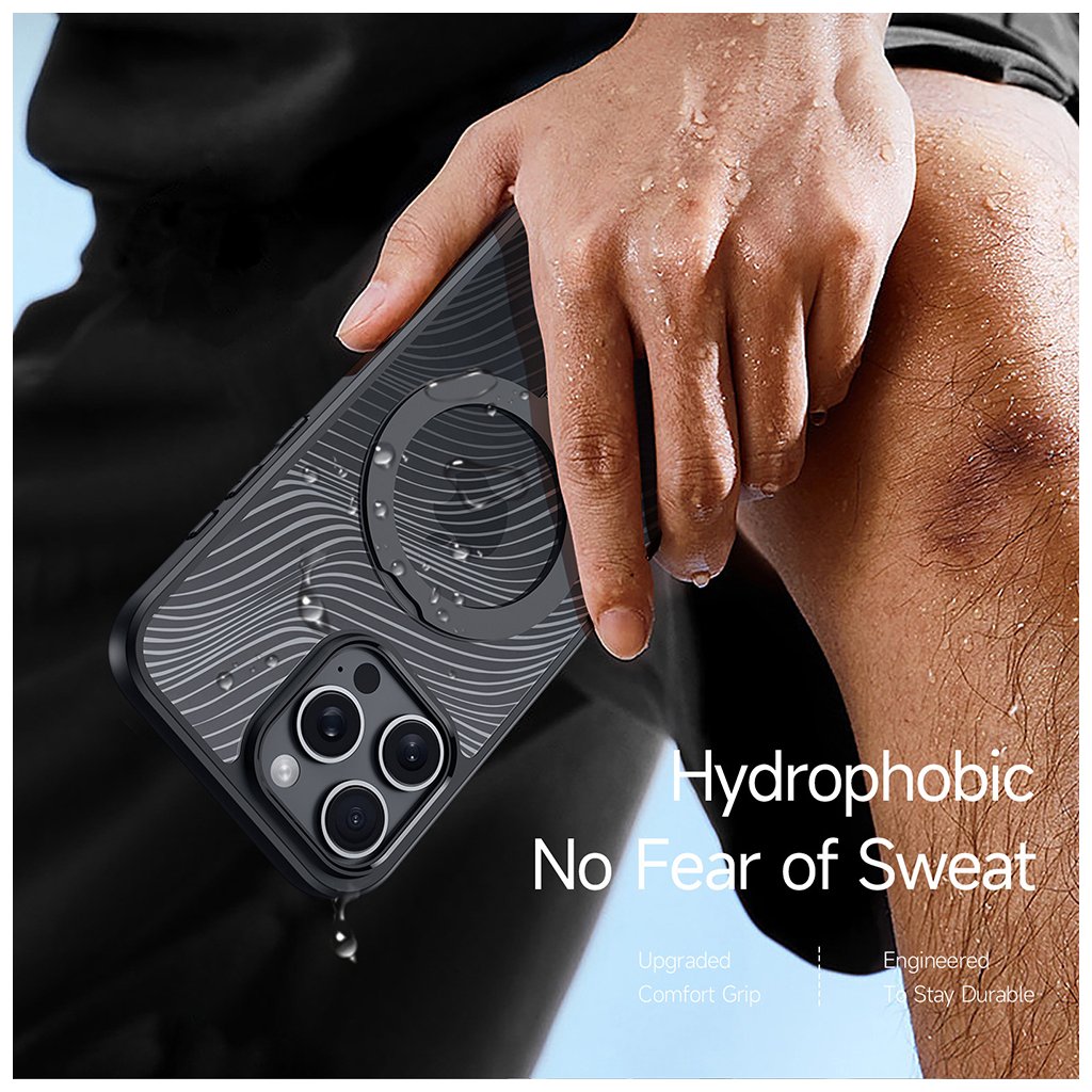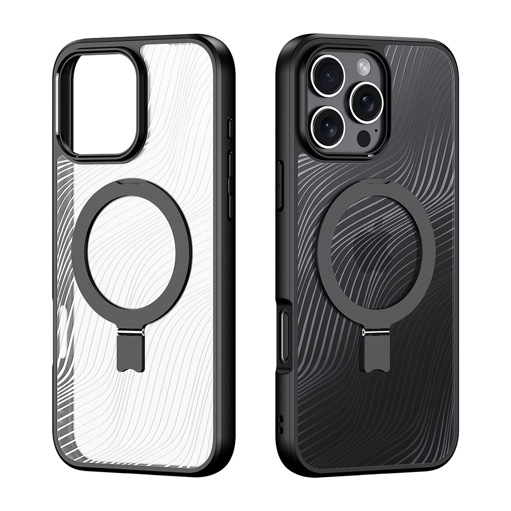 Puzdro Dux Ducis Aimo MagSafe v čiernom prevedení zaujme na prvý pohľad svojim moderným a sofistikovaným dizajnom. Zadná strana je zdobená jemnou vlnitou textúrou, ktorá nielen skvele vyzerá, ale tiež zlepšuje úchop a minimalizuje ulpievanie odtlačkov prstov. Integrovaný MagSafe krúžok zaisťuje perfektnú kompatibilitu s MagSafe príslušenstvom a zároveň slúži ako skladací kovový stojan. Ten umožňuje pohodlné sledovanie obsahu v režime na výšku aj na šírku, čo oceníte pri videohovoroch, prezeraní sociálnych sietí alebo sledovaní filmov.