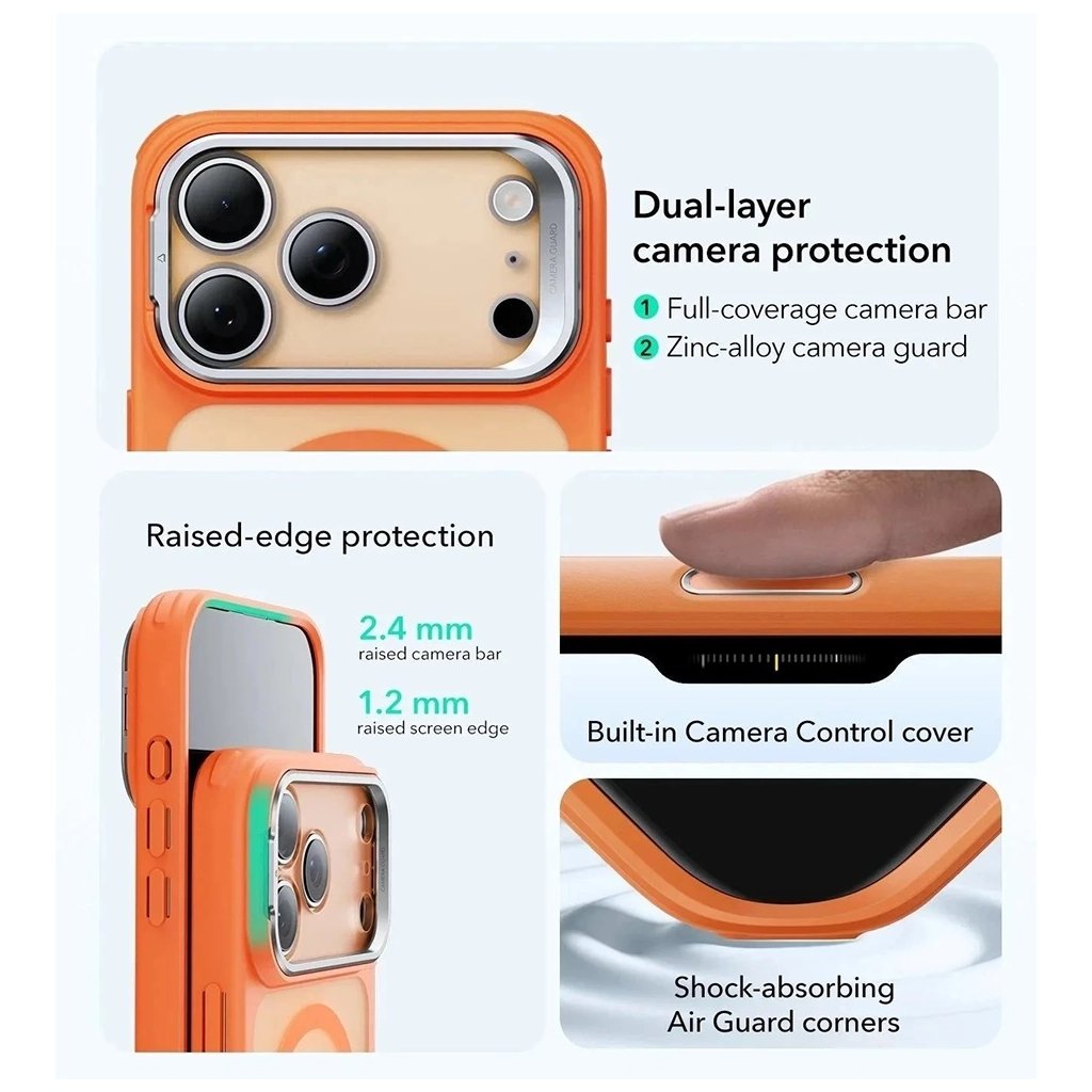 Predstavujeme ESR Classic Hybrid HaloLock Kickstand pre iPhone 17 Pro v elegantnej farbe Frosted Orange. Tento kryt je dokonalou kombináciou štýlu, inovácie a robustnej ochrany, navrhnutý tak, aby váš telefón nielen chránil, ale aj vylepšil jeho funkčnosť.Kľúčové parametre a vlastnosti