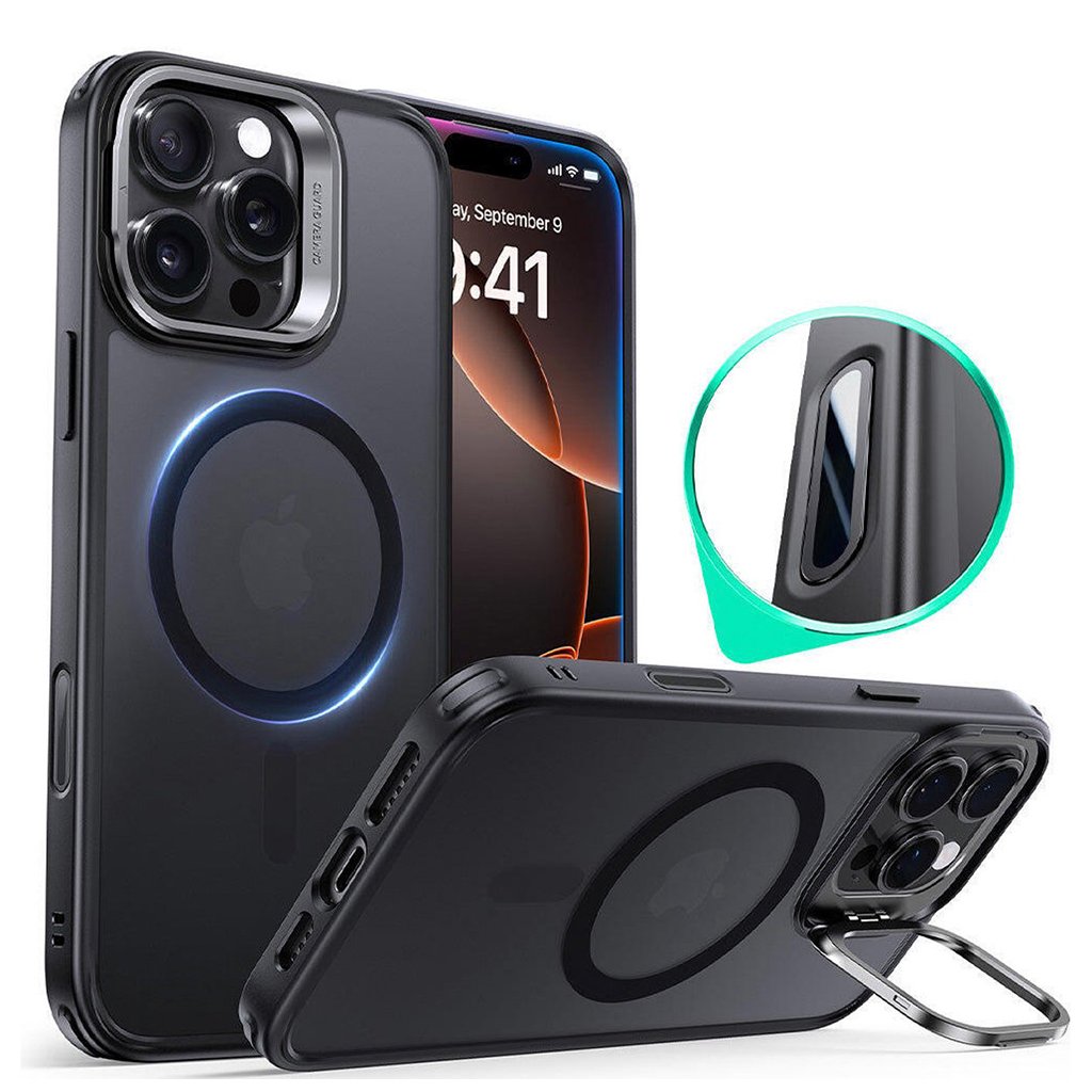 Puzdro ESR Classic Hybrid HaloLock Kickstand pre iPhone 16 Pro v matnej čiernej farbe predstavuje dokonalú kombináciu elegancie a funkčnosti. Jeho dizajn je premyslený do posledného detailu, aby podtrhol originálny vzhľad vášho telefónu a zároveň mu poskytol špičkovú ochranu.