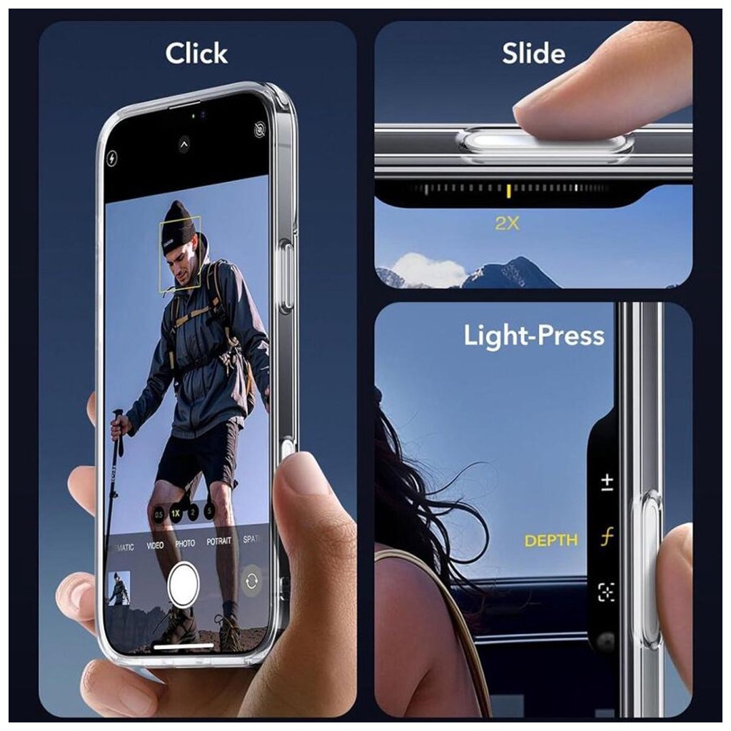 - Unikátna vlastnosť tohto puzdra je inovatívne ovládanie fotoaparátu, ktoré umožňuje jednoduché snímanie snímok a videí pomocou špeciálneho tlačidla na boku krytu, podporujúceho funkcie ako kliknutie, posun a ľahké stlačenie pre rôzne režimy.