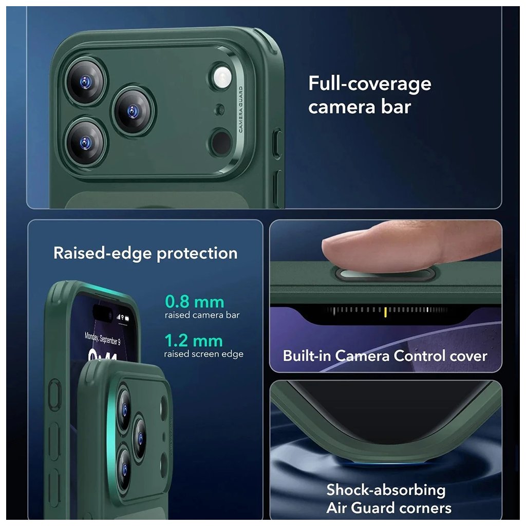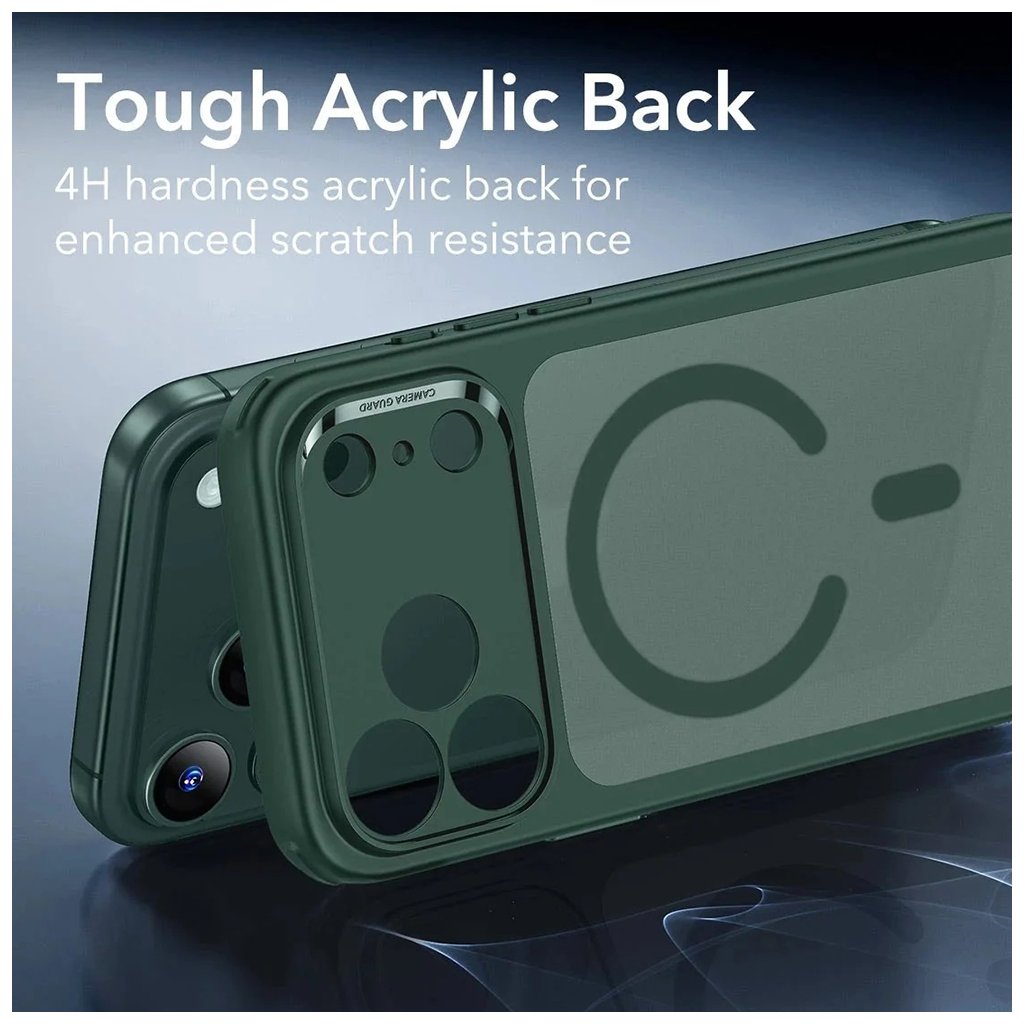 Kryt ESR Classic Hybrid HaloLock v prevedení Zelená Hmla sa vyznačuje premysleným dizajnom, ktorý podčiarkuje eleganciu vášho iPhone 17 Pro Max. * **Zadná strana puzdra:** Vyrobená z krištáľovo čistého materiálu, ktorý je odolný proti žltnutiu a zároveň má jemne matný, priesvitný povrch v odtieni zelenej hmly. Vďaka tomu je decentne viditeľné logo Apple a zároveň je puzdro príjemné na dotyk. * **Integrovaný magnetický krúžok HaloLock™:** Elegantne zapustený do zadnej časti, zaisťuje perfektnú kompatibilitu s MagSafe príslušenstvom. * **Robustný bočný rámček:** V sýtejšom odtieni zelenej poskytuje vojenskú ochranu proti pádom, efektívne absorbuje nárazy a chráni hrany telefónu. * **Zvýšené okraje:** Okolo displeja a modulu fotoaparátu s precíznymi výrezmi pre objektívy zaisťujú maximálnu ochranu proti poškriabaniu a poškodeniu. * **Ochrana tlačidiel:** Tlačidlá sú chránené a zároveň zostávajú plne responzívne. * **Celkový dizajn:** Minimalistický, ale zároveň vysoko funkčný, s dôrazom na dlhú životnosť a estetickú stálosť.Určené pre