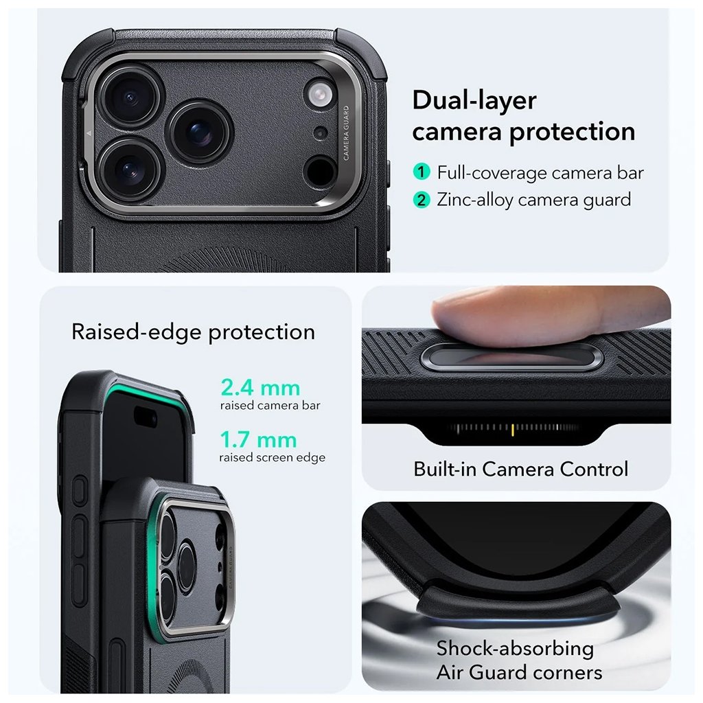 * **Názov produktu:** ESR Cyber Armor Kickstand * **Určené pre:** iPhone 17 Pro Max * **Farba:** Čierna * **Materiál:** Odolný kompozit * **Povrch:** Matný, textúrovaný pre pevný úchop * **Ochranné prvky:** * Zosilnené rohy * Zvýšené okraje okolo displeja * Zvýšené okraje okolo modulu fotoaparátu * **Integrovaný stojan:** Áno, kovový, pre horizontálne sledovanie * **Kompatibilita s bezdrôtovým nabíjaním:** Áno * **Technológia:** HaloLock™ (ekvivalent MagSafe) pre silné magnetické uchytenie * **Značka:** ESRESR: Inovácia a Funkcie v Hlavnej Úlohe