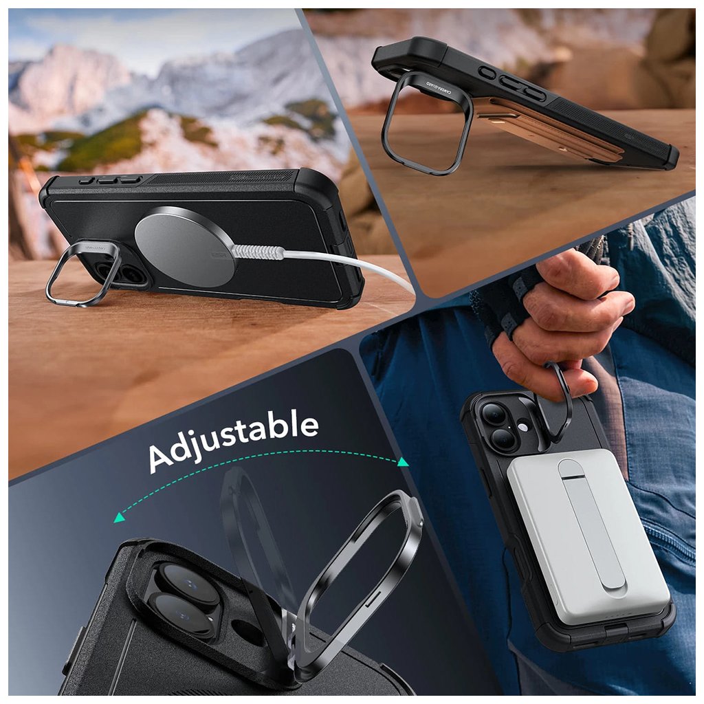 - Kľúčovým prvkom je integrovaný kovový stojan, ktorý je šikovne umiestnený okolo modulu fotoaparátu. Tento stojan je plne nastaviteľný a umožňuje pohodlné sledovanie obsahu v režime na výšku aj na šírku, alebo slúži ako bezpečné pútko na držanie telefónu.