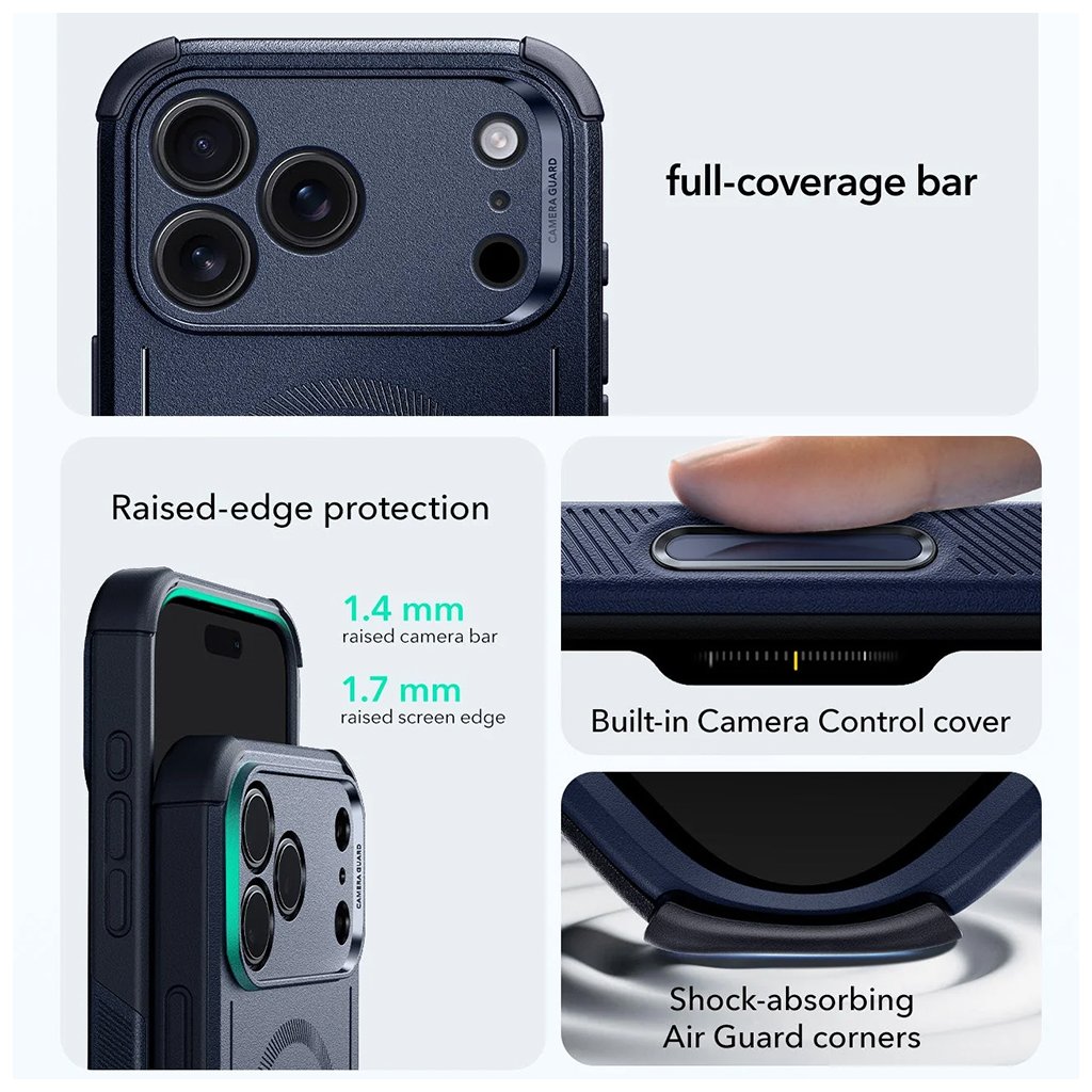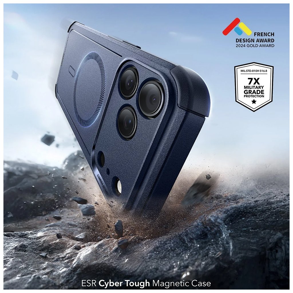Puzdro ESR Cyber Halolock sa vyznačuje moderným a funkčným dizajnom. Jeho tmavo modrá farba dodáva telefónu sofistikovaný vzhľad, zatiaľ čo matný povrch zaisťuje príjemný úchop a minimalizuje odtlačky prstov. Kryt je konštruovaný s dôrazom na maximálnu ochranu – disponuje zosilnenými rohmi, ktoré efektívne absorbujú nárazy pri pádoch. Okolo modulu fotoaparátu je integrovaný zvýšený okraj s nápisom "CAMERA GUARD", ktorý chráni šošovky pred poškriabaním a priamym kontaktom s povrchom. Celkový dizajn je robustný, ale zároveň si zachováva elegantnú líniu.