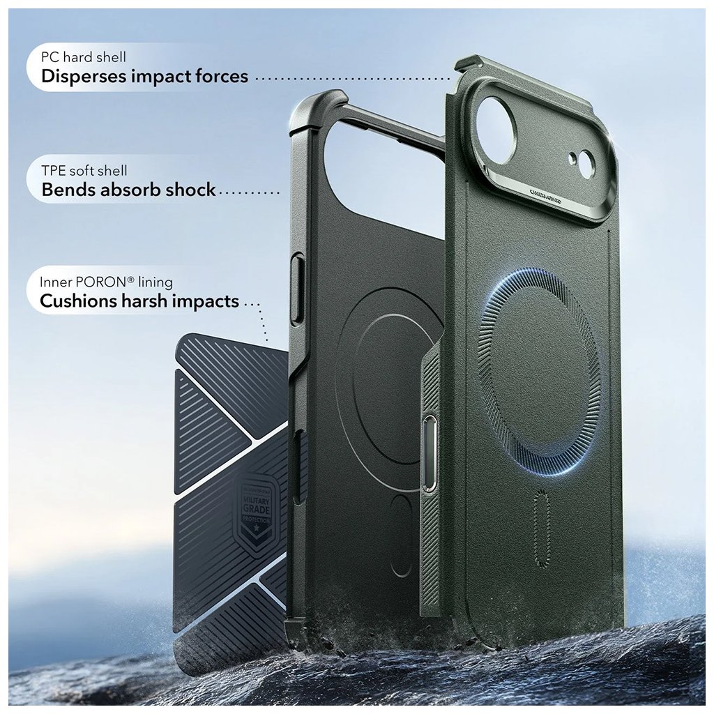 Puzdro ESR Cyber Halolock sa pýši premyslenou viacvrstvovou konštrukciou, ktorá zaisťuje bezkonkurenčnú ochranu. Vonkajší PC hard shell efektívne rozptyľuje nárazové sily, zatiaľ čo vnútorný TPE soft shell absorbuje otrasy. Pre maximálne bezpečie je puzdro vybavené aj vnútornou PORON® podšívkou, ktorá tlmí silné nárazy. Vďaka tejto kombinácii materiálov spĺňa puzdro prísne štandardy vojenskej ochrany (MIL-STD-810H 516.8) a ponúka až 7x vyššiu odolnosť proti pádům.