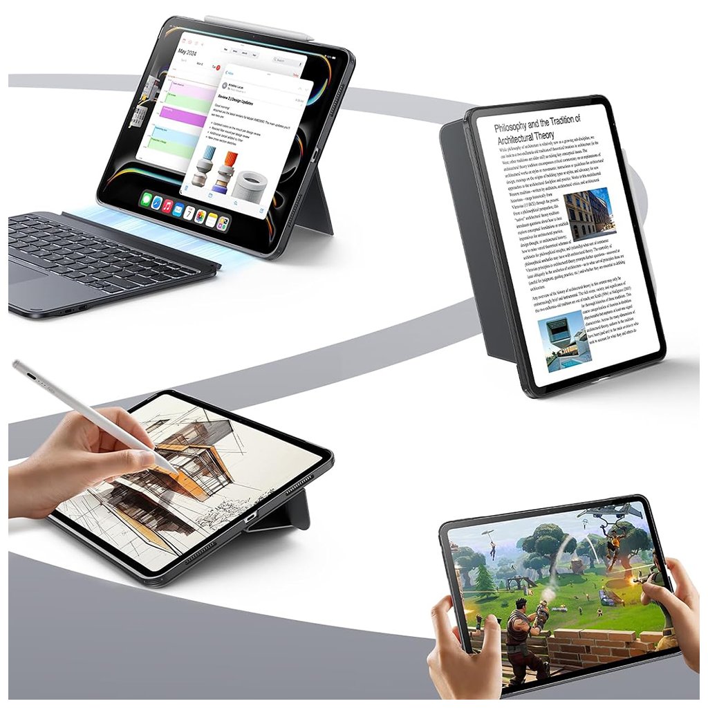 Transformujte svoj iPad Pro na produktívny nástroj s ESR Shift Keyboard Case. Toto inovatívne puzdro v elegantnej tmavo šedej farbe ponúka dokonalú kombináciu štýlu, funkčnosti a spoľahlivej ochrany, ktorá z vášho tabletu urobí plnohodnotnú pracovnú stanicu.