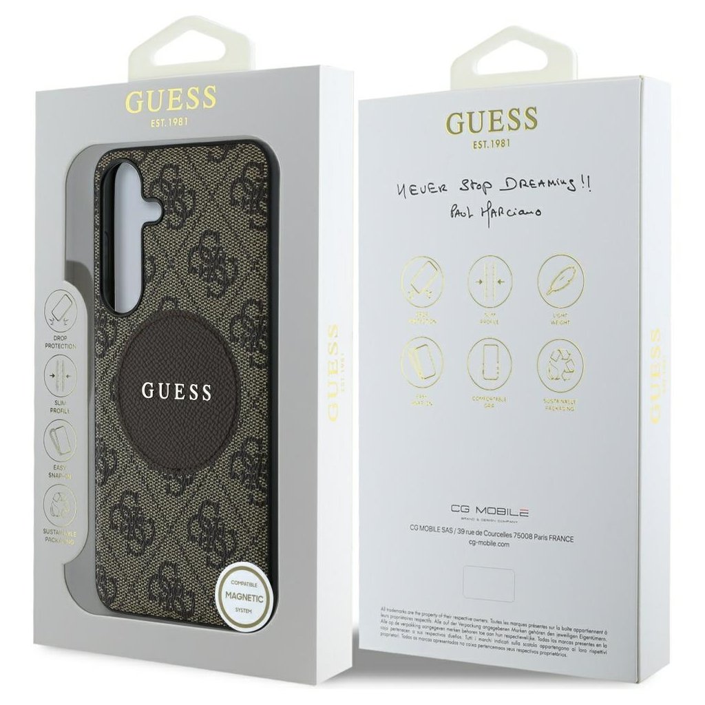 Tento elegantný kryt Guess pre Samsung Galaxy S25 Plus v hnedéj farbe sa pýši ikonickým dizajnom, ktorý okamžite upúta pozornosť. Povrch krytu zdobí celoplošný monogram 4G, ktorý je pre značku Guess charakteristický a dodáva mu luxusný vzhľad. Dominantným prvkom je výrazný kruhový prvok uprostred zadnej strany, na ktorom je elegantne vyrazené logo "GUESS". Tento kruhový detail nielen podčiarkuje sofistikovaný štýl, ale zároveň naznačuje prítomnosť technológie MagSafe, ktorá umožňuje jednoduché a bezpečné prichytenie kompatibilného príslušenstva.