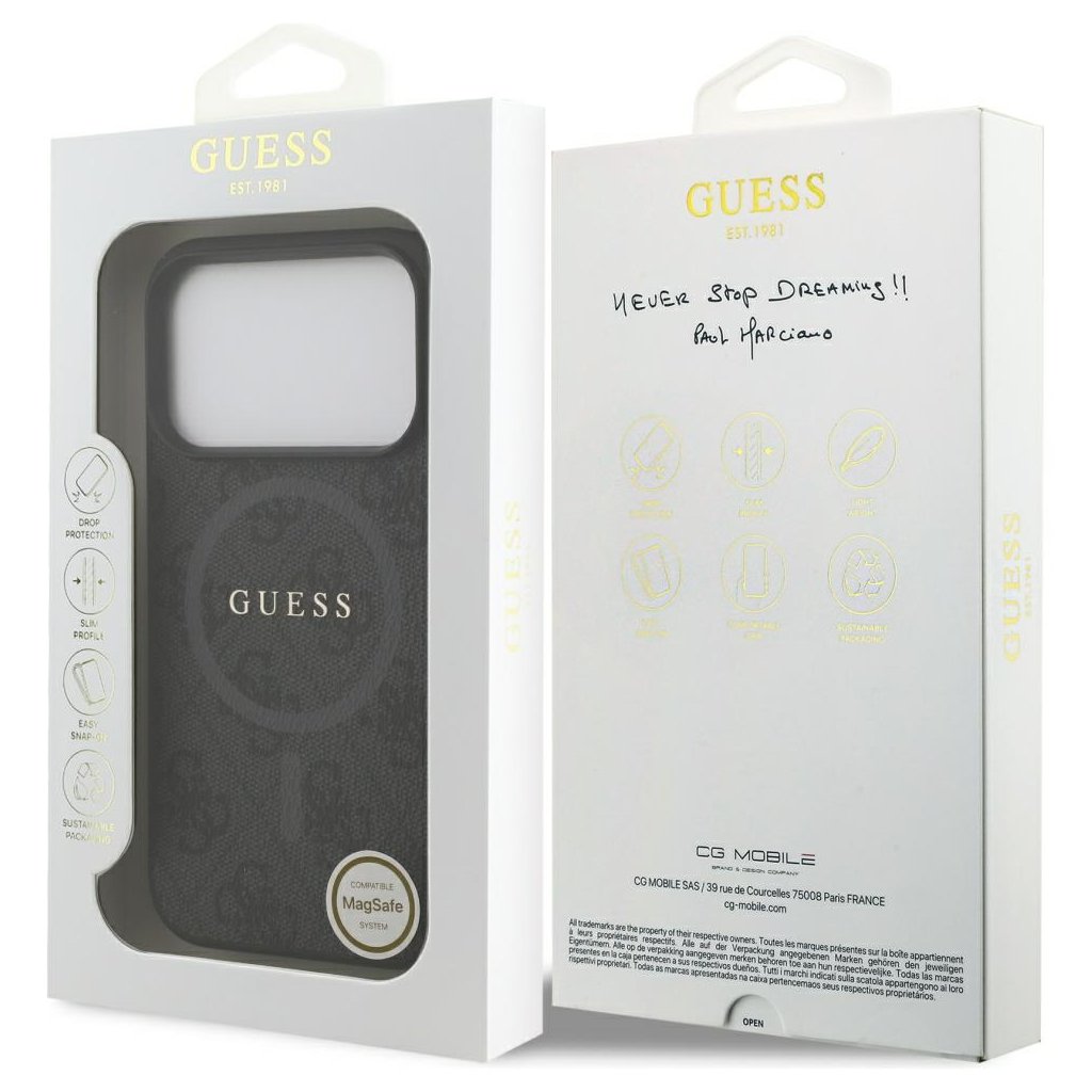 Puzdro sa pýši elegantným čiernym prevedením s charakteristickým 4G monogramom, ktorý je decentne vyrazený po celej zadnej ploche, čo dodáva puzdru sofistikovanú textúru. Uprostred zadnej strany dominuje výrazné logo Guess vo zlatistom odtieni, ktoré okamžite upúta pozornosť a zdôrazňuje prestíž značky. Integrovaná technológia MagSafe zabezpečuje bezproblémové a pevné prichytenie k MagSafe príslušenstvu, zatiaľ čo diskrétny kruhový prvok okolo loga naznačuje túto pokročilú funkciu. Presné výrezy pre fotoaparát a porty zaručujú plnú funkčnosť telefónu bez nutnosti puzdro sňať. Puzdro je navrhnuté tak, aby poskytovalo spoľahlivú ochranu proti poškriabaniu a drobným nárazom, aniž by zbytočne zväčšovalo objem telefónu.