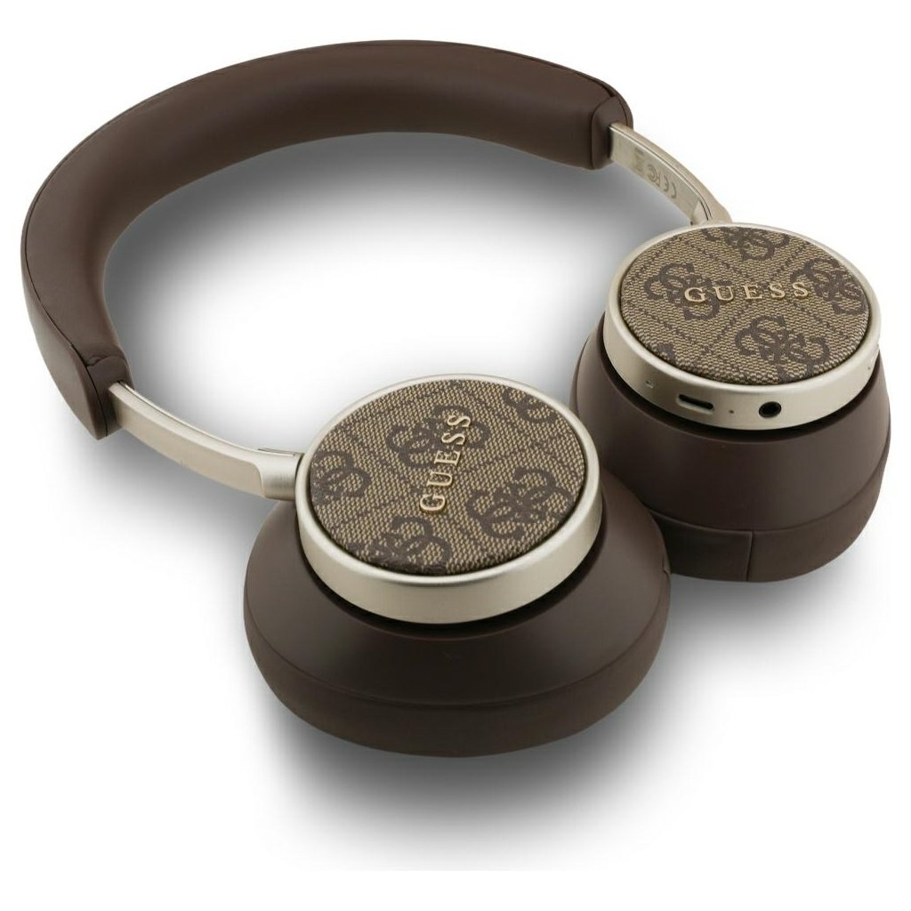 Dizajn slúchadiel Guess 4G Classic Logo je ztelesnením elegancie a luxusu. Dominantná **hnedá farba** v kombinácii s **ikonickým 4G Classic Logo vzorom** na vonkajšej strane náušníkov vytvára sofistikovaný vzhľad. Logo je vyvedené v zlatavých tónoch na textúrovanom hnedom podklade, čo dodáva slúchadlám punc exkluzivity. Hlavový most a náušníky sú potiahnuté **kvalitnou eko kožou** v zodpovedajúcom hnedom odtieni, čo zaisťuje nielen pohodlie, ale aj odolnosť. Strieborné alebo šampanské kovové akcenty okolo náušníkov a na spojovacích prvkoch dodávajú celkovému dizajnu moderný a luxusný nádych.O značke Guess