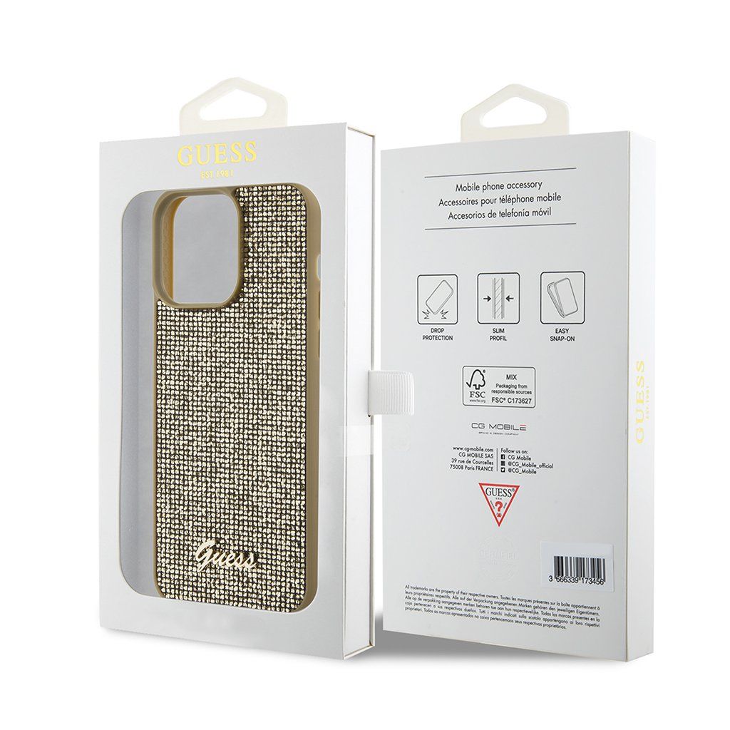 * Inšpirovaný dynamikou diskotékových svetiel. * Zadná strana pokrytá textúrou drobných, trblietavých zlatých štvorčekov, ktoré vytvárajú jedinečný "disco" efekt. * Okraje puzdra sú vyrobené z pružného materiálu v elegantnom zlatavom odtieni. * Dominantou zadnej strany je precízne spracované kovové logo Guess v zlatom prevedení.Parametre a ochrana