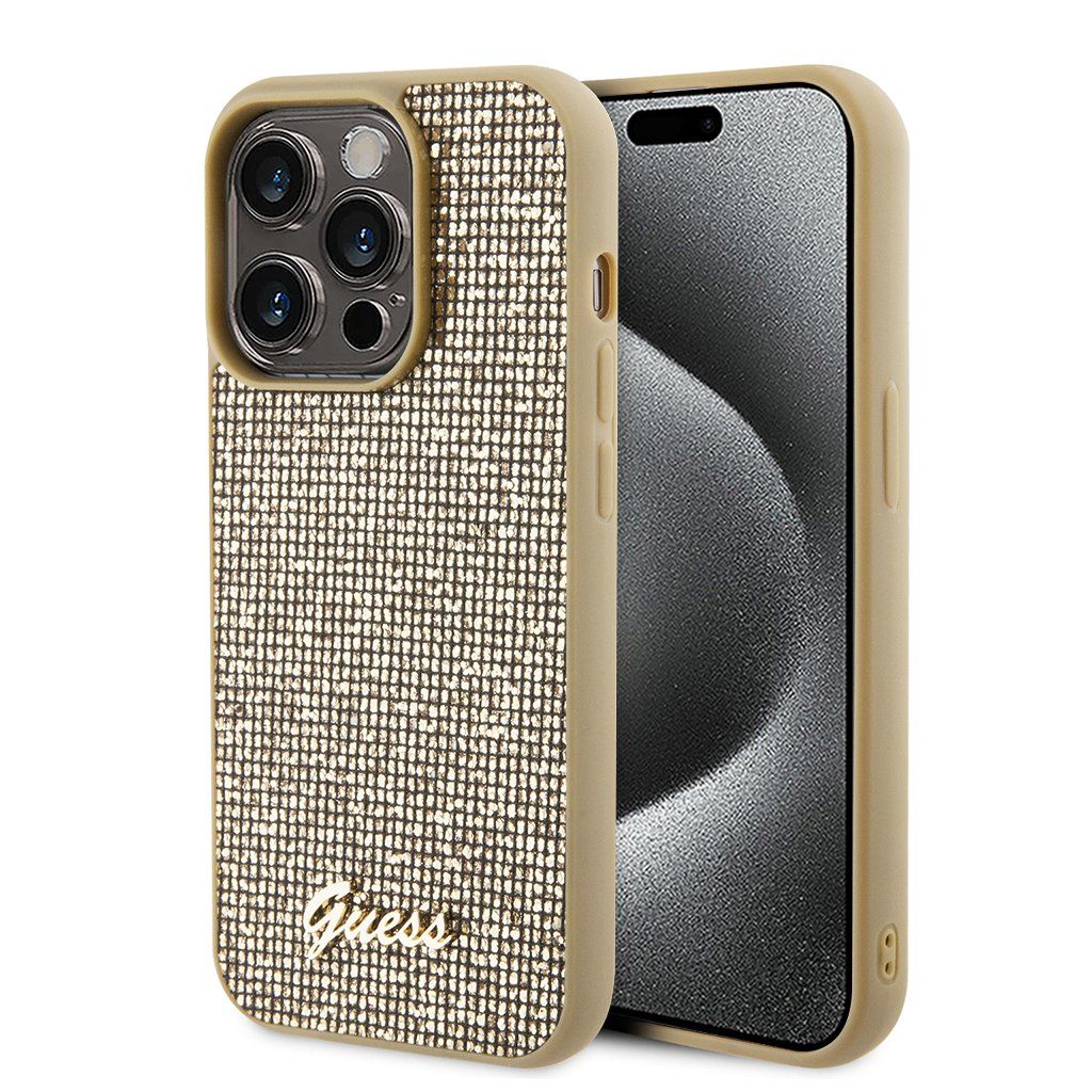 Guess Disco Metal Script iPhone 15 Pro Max zlatý Tento exkluzívny kryt Guess Disco Metal Script prináša ikonický štýl značky Guess pre váš iPhone 15 Pro Max.Dizajn