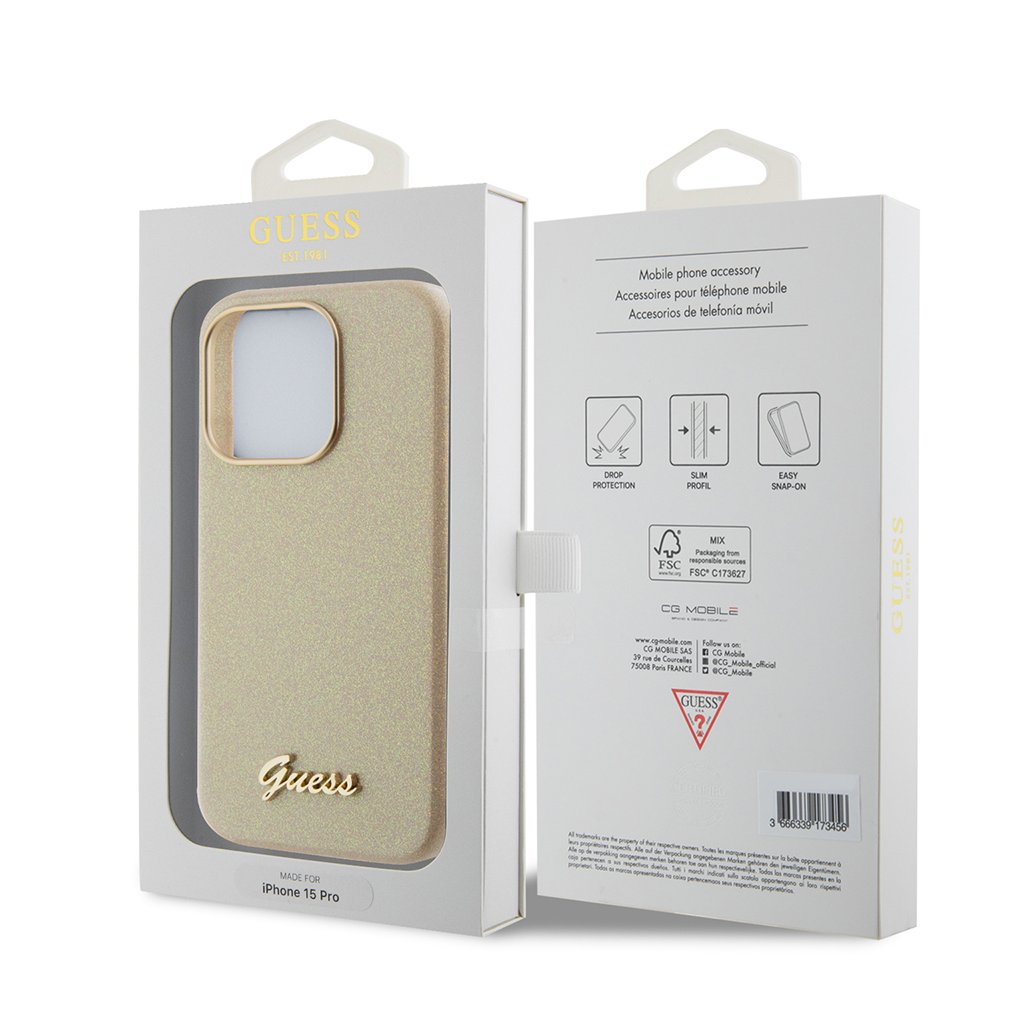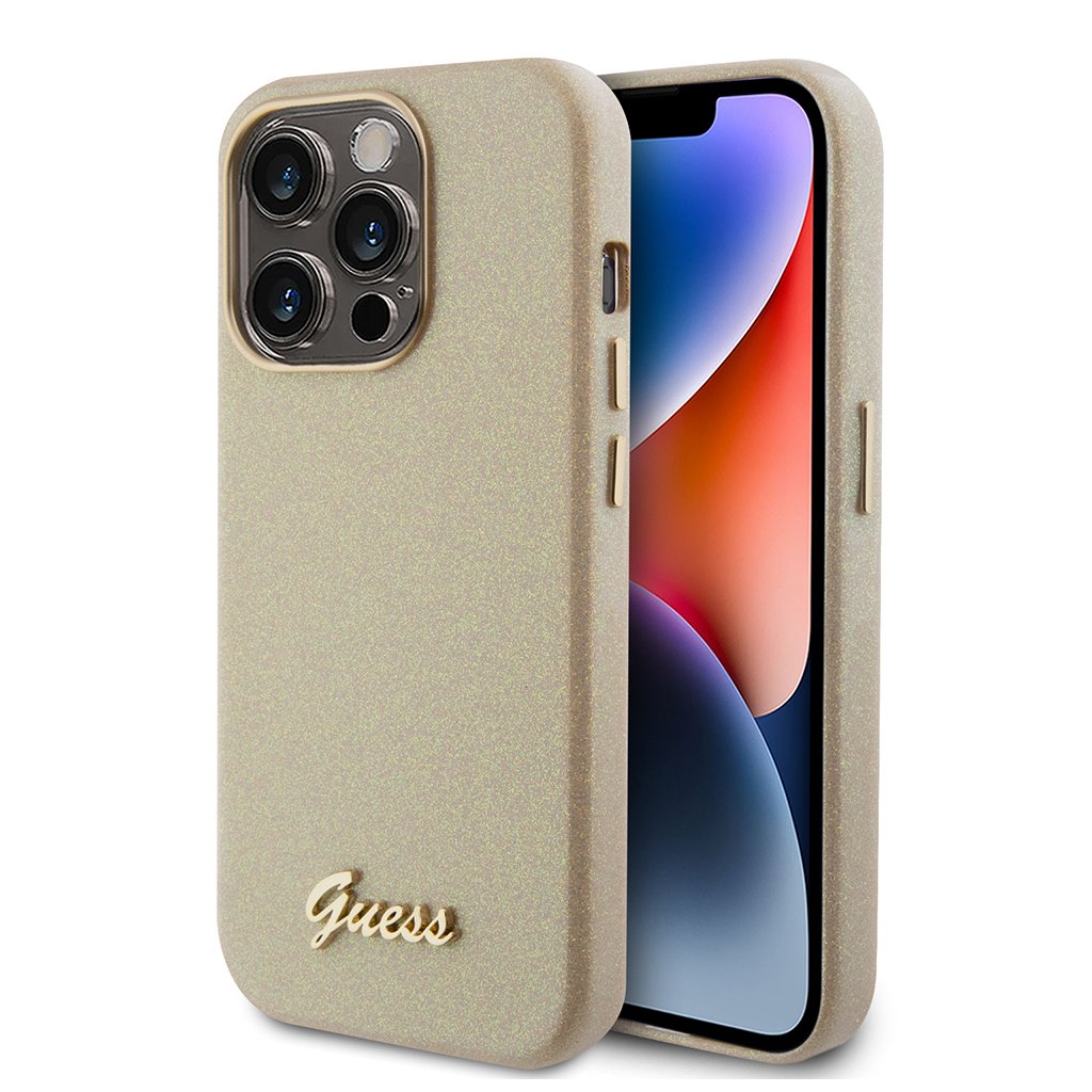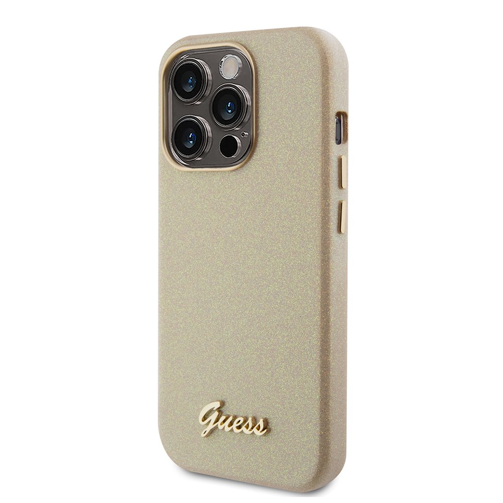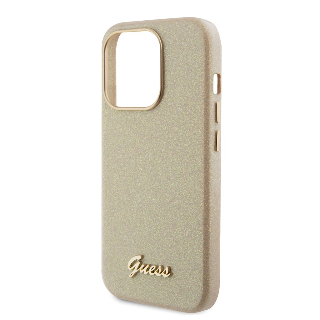 Guess Glitter Glossy Script iPhone 15 Pro Max trblietavá béžová