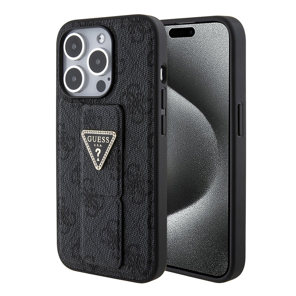 Guess Grip Stand 4G Triangle Strass iPhone 15 Pro Čierna