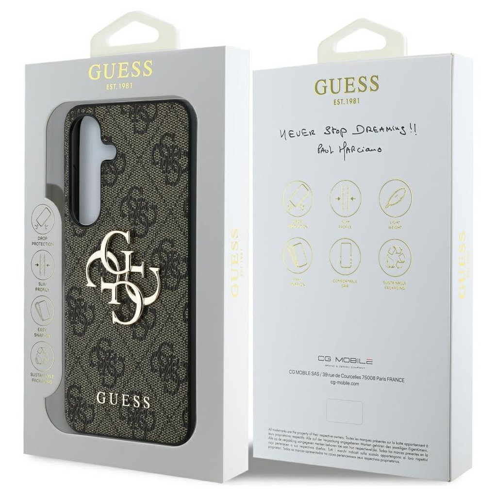 - Elegantný hnedý podklad: Kryt má celoplošný, decentne lesklý 4G monogram, ktorý je pre značku Guess typický.