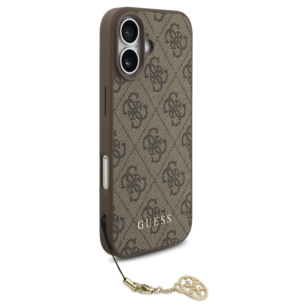 Puzdro sa pýši sofistikovaným dizajnom s celoplošným monogramom 4G v hnedých tónoch, ktorý je pre značku Guess tak typický. Tento vzor dodáva puzdru luxusný a rozpoznateľný vzhľad. Na spodnej časti zadnej strany je decentne umiestnené zlaté logo Guess, ktoré podčiarkuje prémiový charakter produktu. Jedným z najvýraznejších prvkov je elegantný zlatý prívesok s logom Guess, ktorý je pripevnený k puzdru pomocou tenkej retiazky. Tento detail nielenže dodáva puzdru šmrnc, ale zároveň slúži ako štýlový doplnok, ktorý môžete ľahko odopnúť. Puzdro je typu hardcase, čo zaisťuje pevnú a odolnú ochranu proti nárazom a poškriabaniu. Vnútorná strana puzdra je hladká, v jednotnej hnedej farbe, a je vybavená integrovaným magnetickým krúžkom pre technológiu MagSafe, čo zaručuje bezproblémové a rýchle bezdrôtové nabíjanie a kompatibilitu s MagSafe príslušenstvom. Presné výrezy pre fotoaparát, tlačidlá a porty zaisťujú plnú funkčnosť telefónu bez nutnosti puzdro dávať dole. Puzdro je navrhnuté s tenkým profilom a ponúka ochranu proti pádu.Kľúčové vlastnosti: