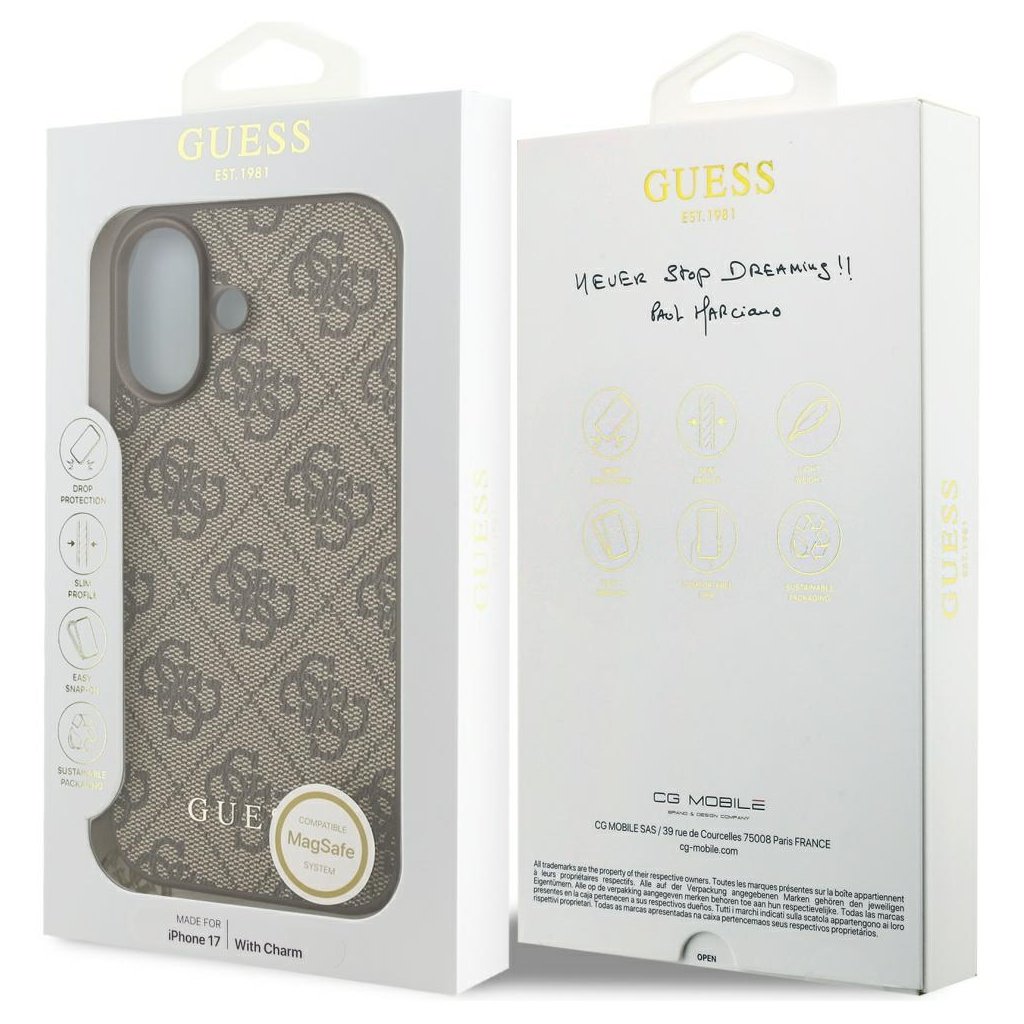 Predstavujeme vám exkluzívne ochranné puzdro **Guess Hardcase 4G Charm Cradle MagSafe**, ktoré je dokonalou kombináciou ikonického módneho štýlu a modernej funkčnosti pre váš iPhone 17. Tento elegantný doplnok v hnedej farbe je navrhnutý tak, aby podčiarkol vašu osobnosť a zároveň poskytol spoľahlivú ochranu vášmu telefónu.Dizajn a parametre