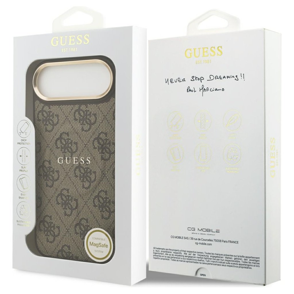 Predstavujeme vám exkluzívny ochranný kryt Guess Hardcase 4G Classic MagSafe v elegantnej hnedej farbe, ktorý je navrhnutý tak, aby dokonale doplnil váš iPhone 17 Air. Tento kryt nie je len ochranou, ale predovšetkým štýlovým doplnkom, ktorý podčiarkne váš osobitý vkus a lásku k ikonickej módnej značke Guess. Spája v sebe sofistikovaný dizajn s modernou funkčnosťou MagSafe, čím zaisťuje nielen ochranu, ale aj bezproblémové používanie všetkých funkcií vášho telefónu. Ikonický dizajn a prémiové materiály Dizajn tohto hardcase krytu je stelesnením klasickej elegancie značky Guess. Zadná strana je zdobená charakteristickým 4G monogramom, ktorý je vkusne vyvedený v hnedých tónoch a dodáva krytu luxusný textúrovaný vzhľad. Uprostred sa pýši výrazné logo GUESS, ktoré okamžite upúta pozornosť. Okolie fotoaparátu je elegantne zvýraznené lesklým zlatým/bronzovým kovovým rámčekom, ktorý dodáva celkovému vzhľadu punc exkluzivity a dokonale ladí s hnedým prevedením krytu. Boky krytu sú v jednotnej hnedej farbe a tlačidlá sú precízne spracované pre jednoduché ovládanie. Integrovaný magnetický krúžok MagSafe zaisťuje perfektnú kompatibilitu s bezdrôtovým nabíjaním a MagSafe príslušenstvom. Guess: Symbol mladistvého luxusu Guess je ikonická americká módna značka, ktorú v roku 1981 založili bratia Marcianovci. Hoci sa firma celosvetovo preslávila predovšetkým svojimi inovatívnymi "stone-washed" džínsami a provokatívnymi čiernobielymi reklamami, ktoré definovali imidž supermodeliek 90. rokov, Guess sa rýchlo stal symbolom mladistvého, sexi a dobrodružného životného štýlu. Ich ikonické logo s otáznikom v trojuholníku je dnes globálne rozpoznateľným znakom luxusu a sebavedomého módneho vkusu. Kryty na mobilné telefóny Guess verne prenášajú túto módnu DNA priamo do vašej ruky. Nezameriavajú sa na extrémnu vojenskú odolnosť, ale sú navrhnuté ako prémiový a štýlový doplnok, ktorý má dokonale ladiť s vaším outfitom, kabelkou alebo peňaženkou. Pre kryty Guess je typické výrazné použitie loga – či už v podobe elegantného kovového trojuholníka alebo celoplošného monogramu 4G. Kľúčové vlastnosti a ochrana- Vyrobené z odolných materiálov pre spoľahlivú ochranu proti pádom a poškriabaniu.
