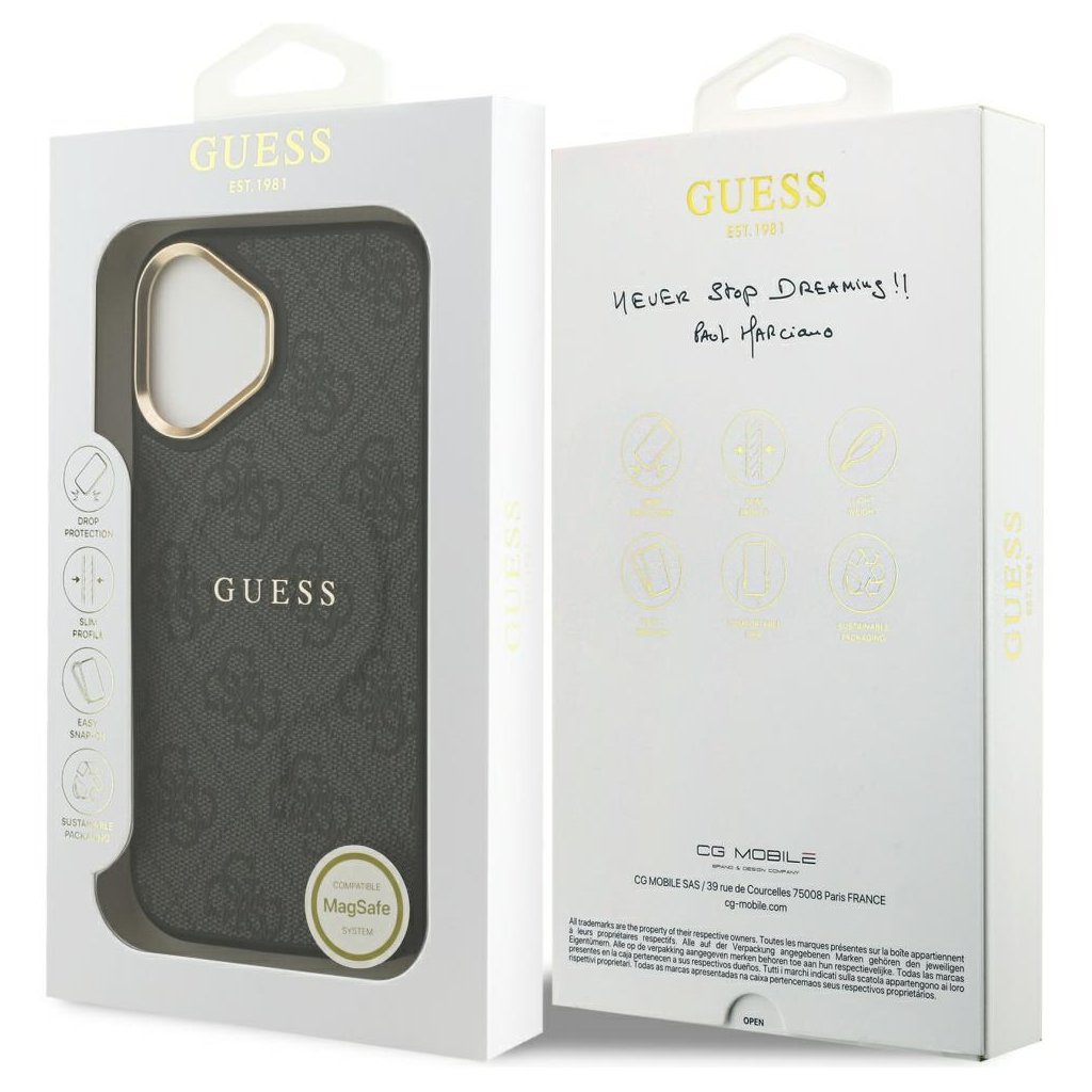 Guess Hardcase 4G Classic MagSafe iPhone 17 čierny Predstavujeme vám exkluzívne ochranné puzdro Guess Hardcase 4G Classic MagSafe, ktoré dokonale spája ikonický módny štýl značky Guess s praktickou ochranou pre váš iPhone 17. Tento elegantný doplnok je navrhnutý tak, aby podčiarkol vašu osobnosť a zároveň poskytol vášmu telefónu sofistikovaný vzhľad. Ikonický štýl značky Guess Guess je celosvetovo preslávená americká módna značka, založená bratmi Marcianovými v roku 1981. Značka sa preslávila svojimi inovatívnymi "stone-washed" džínsami a provokatívnymi čiernobielymi reklamami, ktoré definovali imidž supermodeliek 90. rokov. Guess sa rýchlo stal symbolom mladistvého, sexi a dobrodružného životného štýlu. Ich ikonické logo s otáznikom v trojuholníku je dnes globálne rozpoznateľným znakom luxusu a sebavedomého módneho vkusu. Kryty na mobilné telefóny Guess verne prenášajú túto módnu DNA priamo do vašej ruky, sú navrhnuté ako prémiový a štýlový doplnok, ktorý má dokonale ladiť s vaším outfitom. Dizajn a parametre Puzdro Guess Hardcase 4G Classic MagSafe v čiernej farbe (model GUHMP17SP4MSEGCK) sa pýši sofistikovaným dizajnom. Zadná strana je pokrytá elegantným, opakujúcim sa 4G monogramom, ktorý je pre značku Guess typický. Uprostred zadnej strany je výrazne umiestnené zlaté logo GUESS, ktoré dodáva puzdru punc luxusu. Zlaté detaily sa objavujú aj na rámčeku okolo modulu fotoaparátu a na bočných tlačidlách, čo vytvára pôsobivý kontrast s čiernym podkladom. Puzdro je typu hardcase, čo zaisťuje pevnú a spoľahlivú ochranu proti poškriabaniu a menším nárazom. Integrovaná technológia MagSafe umožňuje jednoduché a bezpečné pripevnenie MagSafe príslušenstva a bezdrôtové nabíjanie. Kľúčové vlastnosti- Typ puzdra: Hardcase