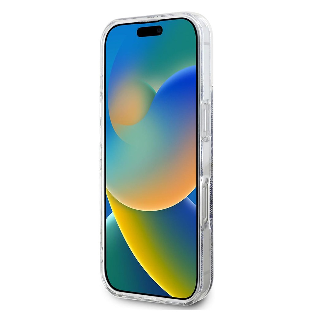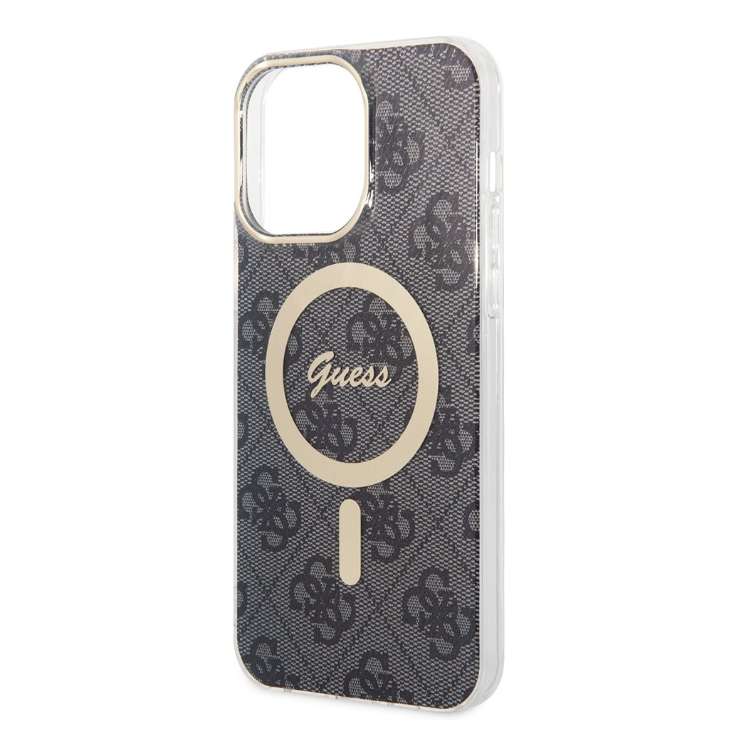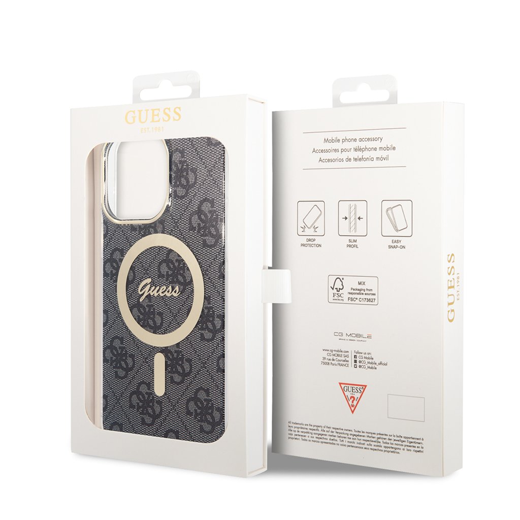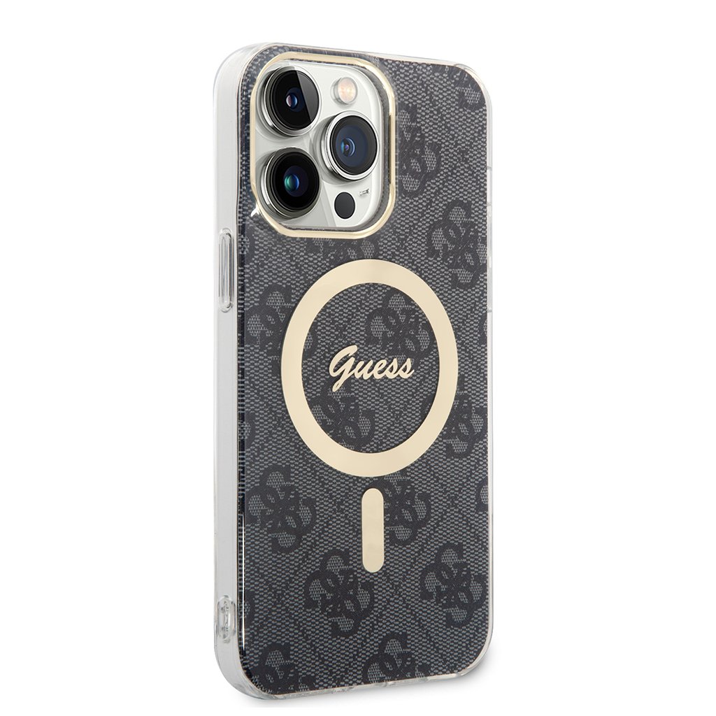- Dizajn: Celoplošný 4G monogram, zlatistý MagSafe kruh s logom Guess, transparentné boky, zlatisté lemovanie fotoaparátu