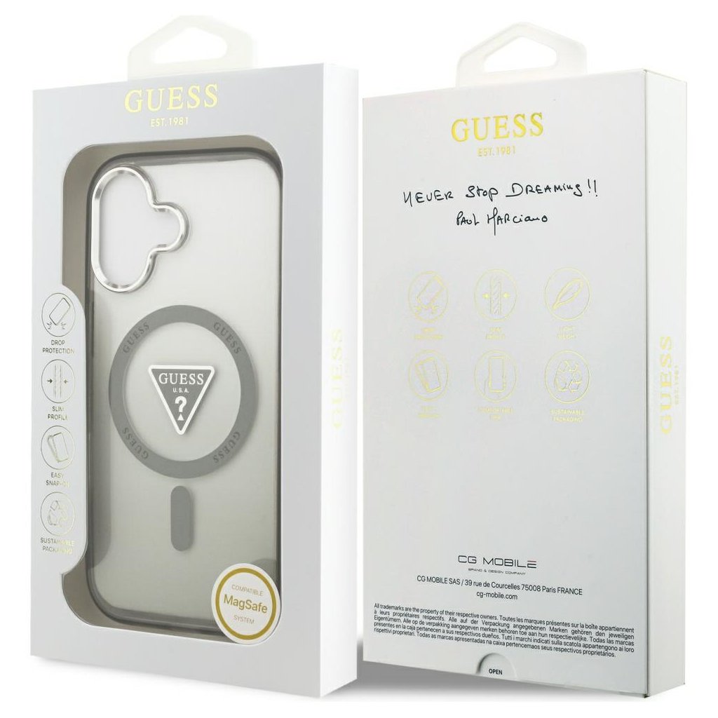 Pouzdro sa vyznačuje jemným gradientom, ktorý prechádza od svetlejšieho k tmavšiemu odtieňu khaki, dodávajúc mu sofistikovaný vzhľad. Dominantou zadnej strany je integrovaný MagSafe kroužek, v ktorom sa hrdě vyjímá ikonické trojúhelníkové logo Guess s nápisom "GUESS U.S.A." a otazníkom, symbolizujúcim značku a dodávajúcim pouzdru nezameniteľný punc luxusu.
