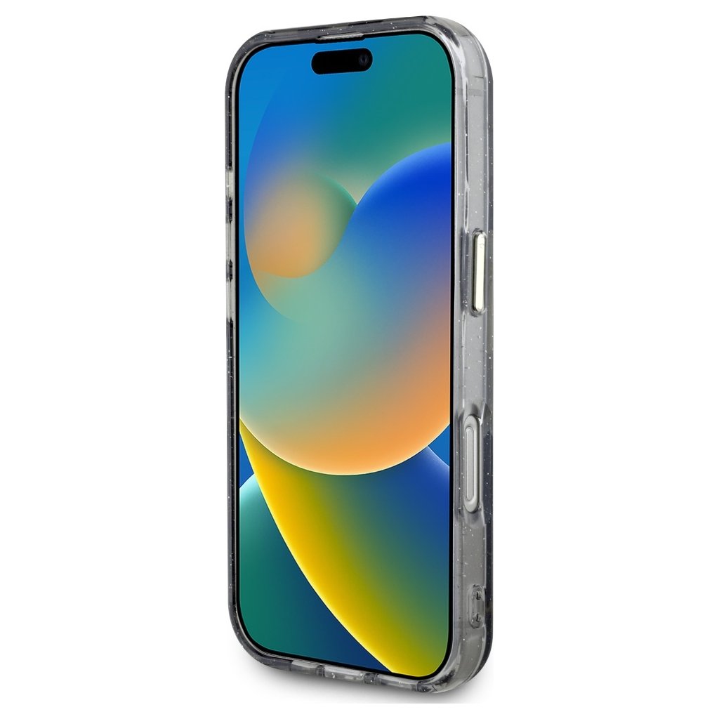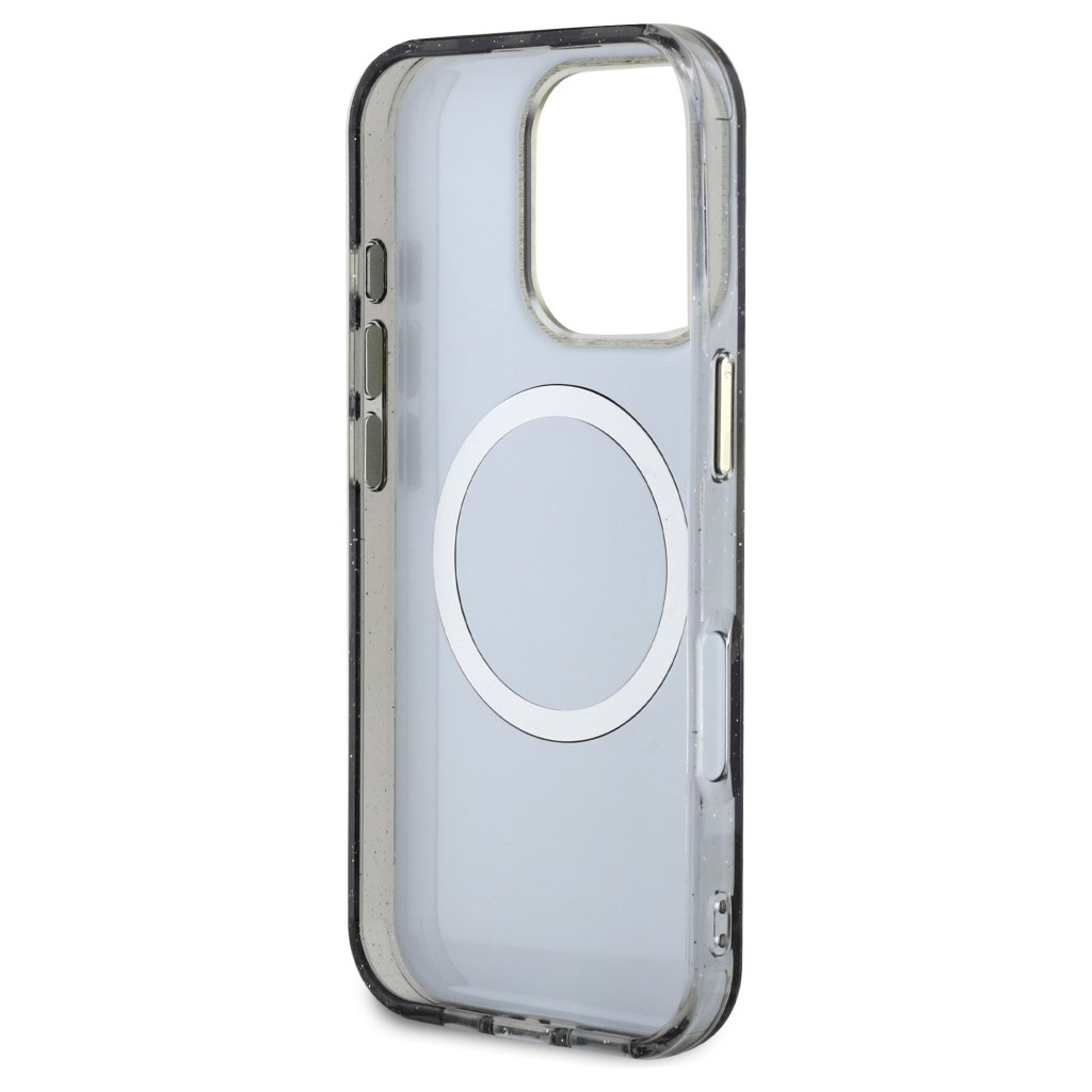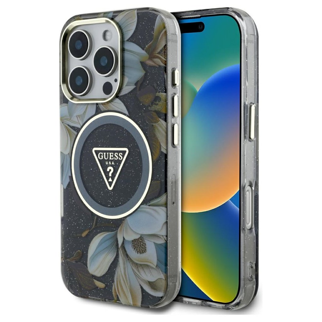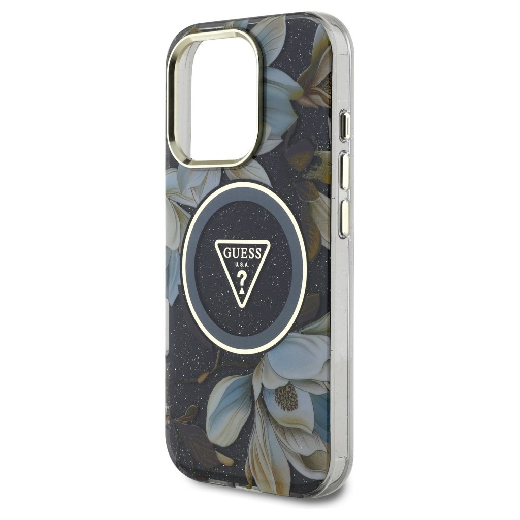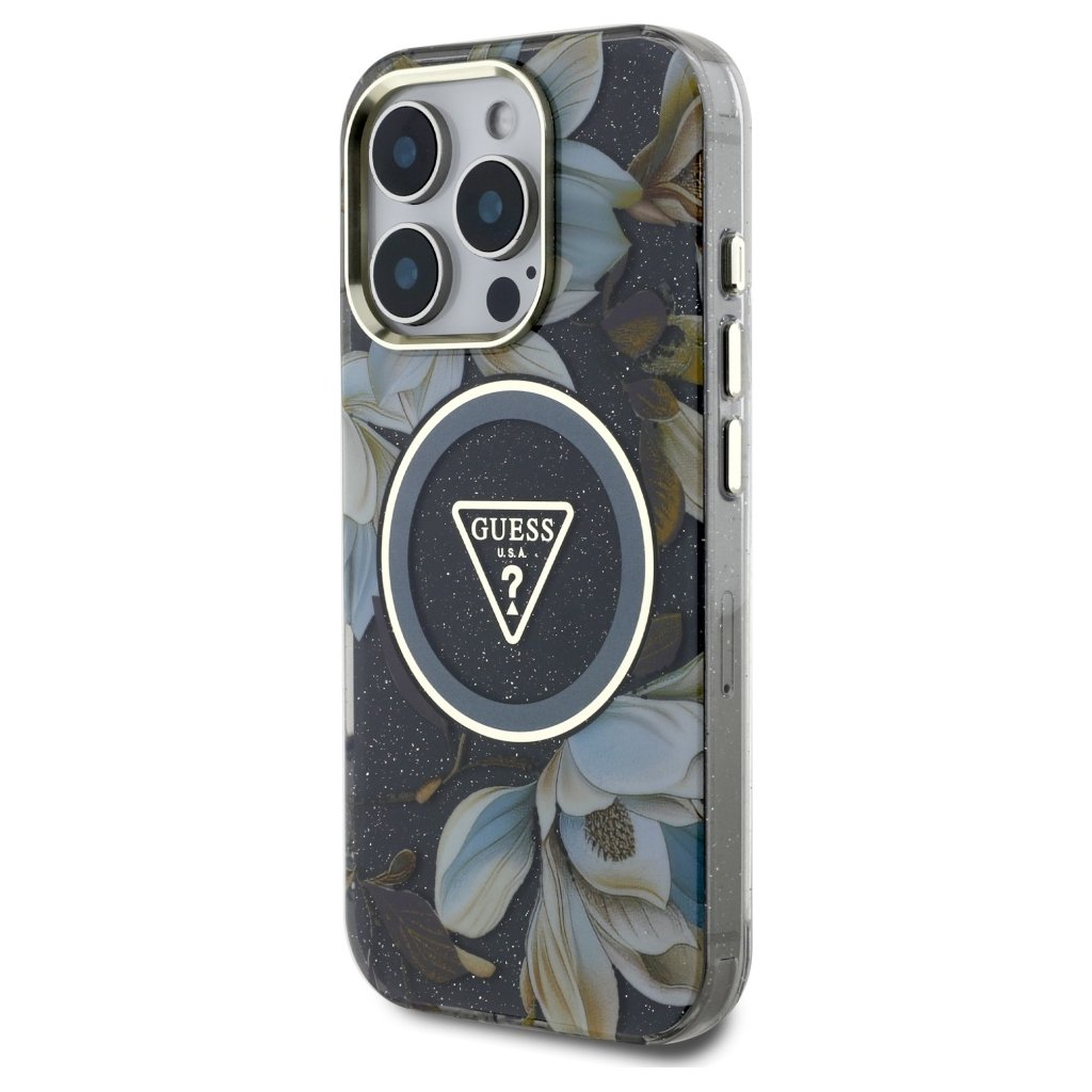 Guess IML Metal Glitter Flowers Triangle MagSafe iPhone 16 Pro čierny