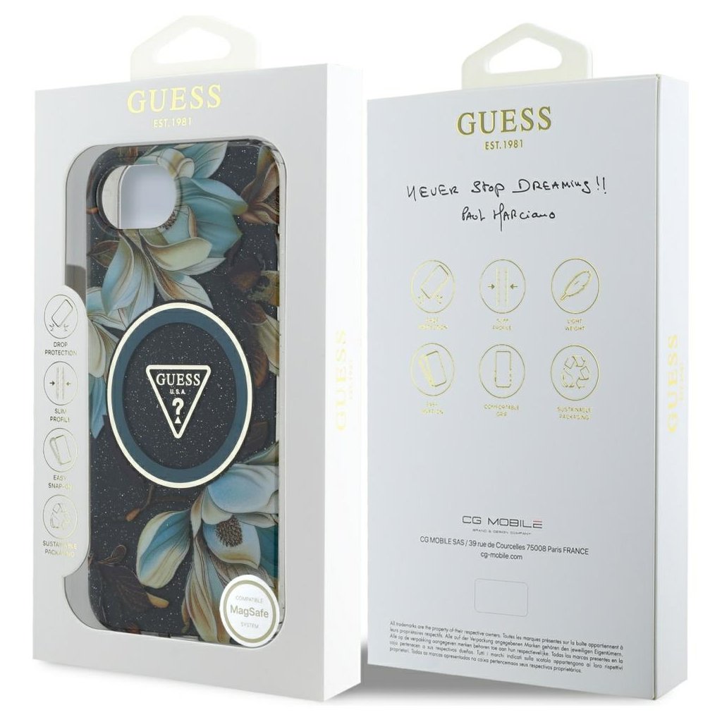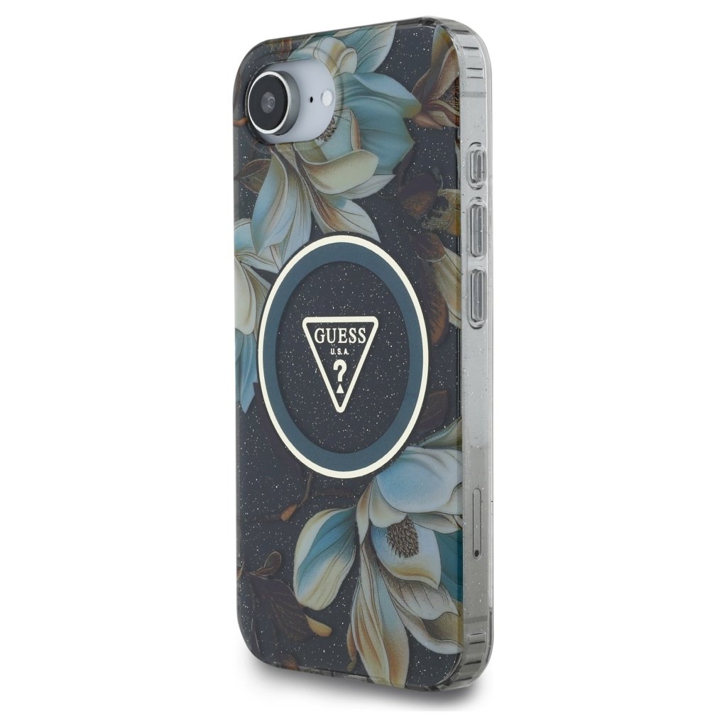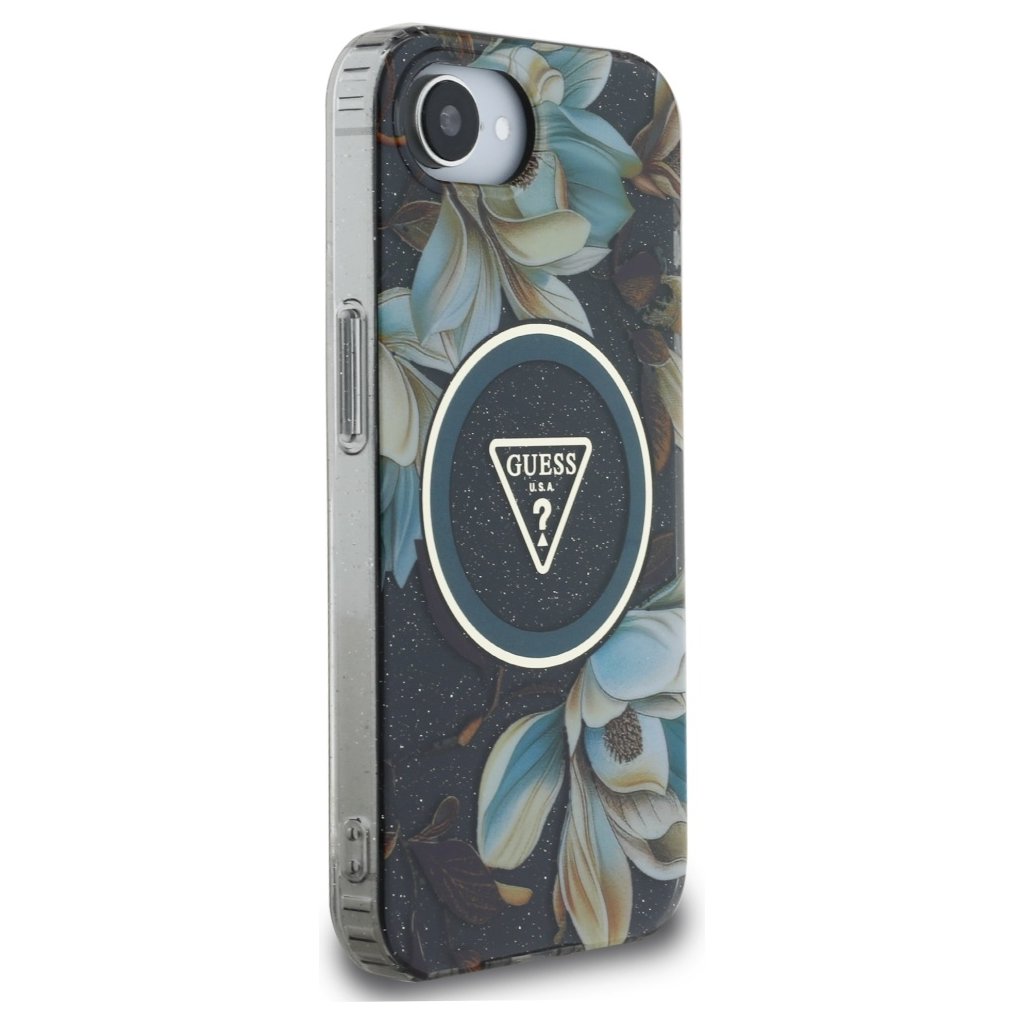 Guess IML Metal Glitter Flowers Triangle MagSafe iPhone 16e čierny